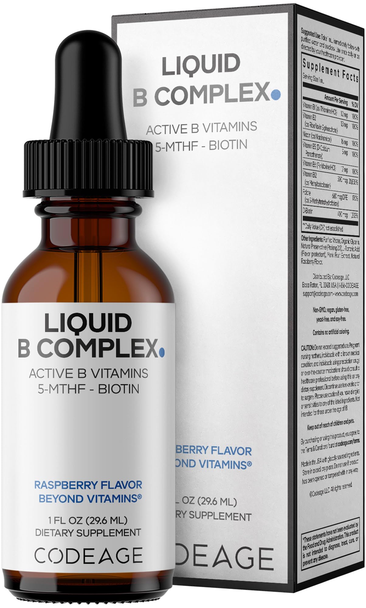Manufactured in the USA: Codeage Liquid B-Complex vitamins formula is manufactured in the USA in a cGMP-certified facility using global ingredients for quality and purity. Non-GMO B-Complex Formula: This vitamin B supplement is non-GMO, vegan, gluten-free, soy-free, and yeast-free and contains no artificial coloring. Liquid Raspberry Flavor: Codeage Liquid B-Complex comes in a delicious and easy-to-take raspberry flavored liquid with monk fruit extract. This liquid vitamin B supplement can be taken directly by mouth for a simple and convenient daily use. Active and Methylated Forms: This vitamin b complex supplement features active coenzyme and methylated forms of B vitamins, including methylcobalamin, 5-MTHF folate, and riboflavin-5'-phosphate for an advanced vitamin profile. There are several distinct forms of vitamin B, each serving a unique role, making it valuable to obtain a complete spectrum of B vitamins in one formula. 8 Full Spectrum B Vitamins: Codeage Liquid B-Complex supplement delivers a complete blend of eight B liquid vitamins, including Vitamin B1 (thiamine), Vitamin B2 (riboflavin), Vitamin B3 (niacin), Vitamin B5 (pantothenic acid), Vitamin B6 (pyridoxine), Vitamin B7 (biotin), Vitamin B9 (5-MTHF folate), and Vitamin B12.