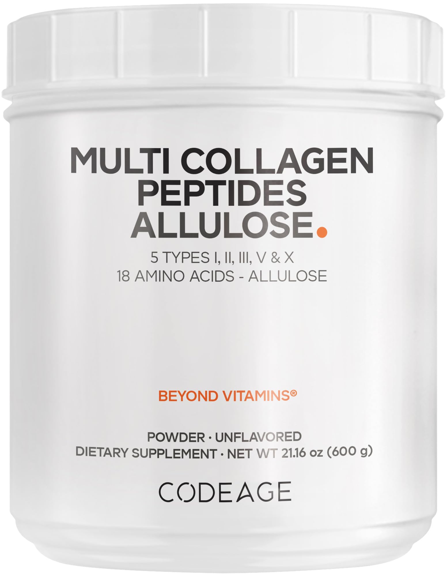 Manufactured in the USA: Codeage Multi Collagen Peptides Allulose is manufactured in the USA with global ingredients in a cGMP-certified facility for quality and purity. Convenient to mix: This unflavored collagen powder and allulose supplement formula is convenient to mix in coffee, tea, protein shakes, beverages, or other food recipes. This multi collagen allulose is non-GMO, dairy, soy, and gluten-free. It is also shellfish-free. 18 Amino Acids: This multi collagen peptides formula provides 18 amino acids. Each bottle provides 30 servings for 1 month of supply. Rare Sugar Allulose: This multi collagen protein powder supplement also offers allulose sweetener, a naturally occurring sugar with 0 calories, 0 net carbs. Allulose is a rare, zero calorie sugar alternative offering a clean, subtly sweet taste without the aftertaste often associated with stevia, aspartame, erythritol, monk fruit, or other sweeteners. 5 Collagen Types: Codeage Multi Collagen Allulose powder features 5 collagen types from 5 different food sources, including grass-fed and hydrolyzed bovine collagen.
