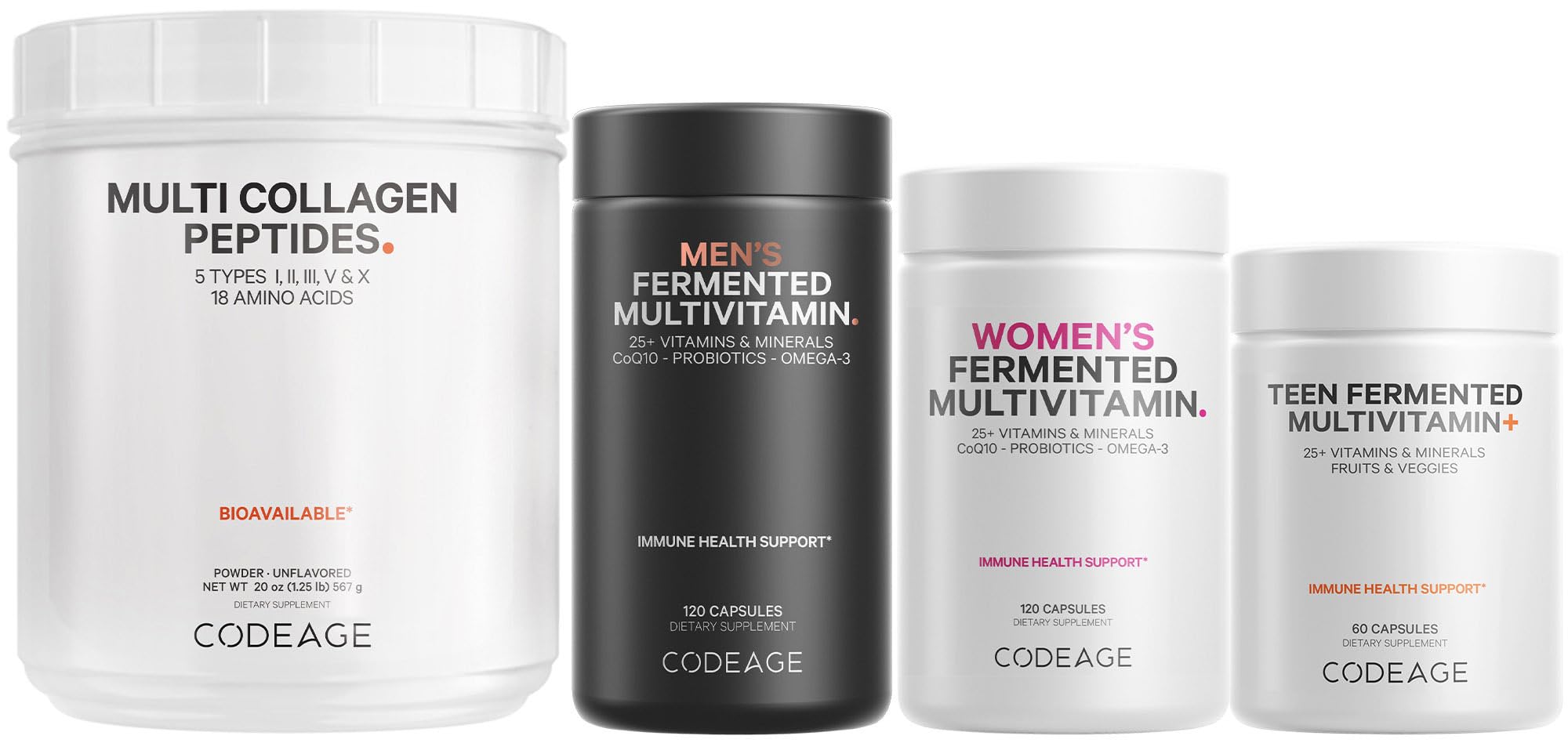 Fermented Vitamins: Codeage daily men, women and teen vitamins offer fermented vitamins. Fermented supplements are formulated to help with the bioavailability of nutrients. . 25 Daily Vitamins Minerals: Codeage Men, Women Teen daily multivitamins is designed specifically for Men, Women and Teens, whole family multivitamin. These premium formulas offer 25 daily vitamins and minerals in an all-in-one solution. Our men, women and teens multi are made with real whole foods and offers probiotics, fermented vitamins, enzyme-activated minerals, fruits, vegetables and more. Easy to mix in smoothies, soups, coffees or baked goods. Collagen makes up 30 percent of all proteins in the body and functions to hold the body together. It works to support hair, skin, nails, joints, and your gut!. Premium All-In-One Bone Broth Collagen Peptides: Get your Collagen needs covered with this all-in-one, premium collagen and bone broth supplement with a high-quality blend of grass-fed beef, chicken, wild caught fish, and eggshell collagens, providing collagen Types I, II, III, V and X.