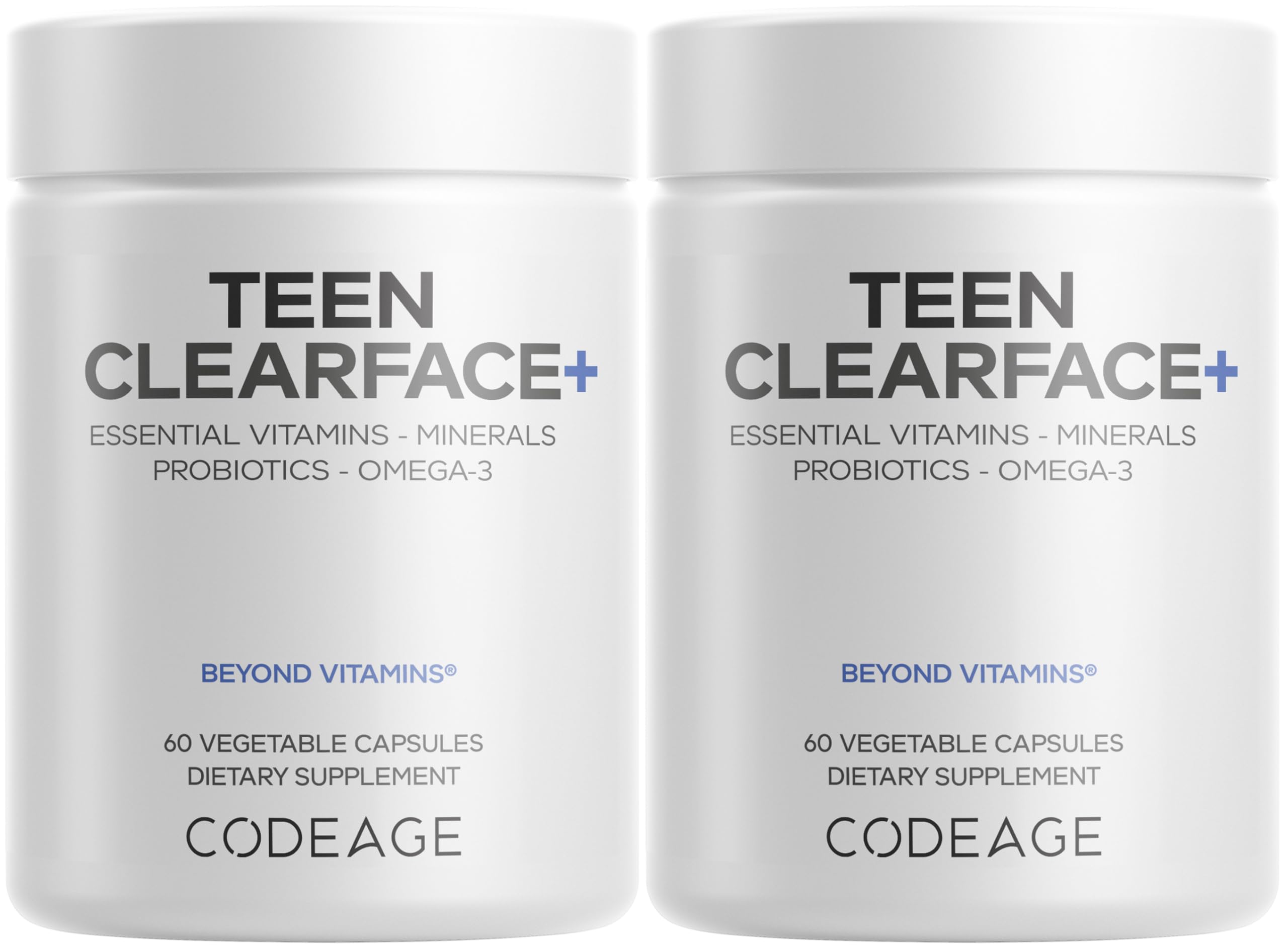 Codeage Teen Clearface Adolescent Face Skin & Pimples Vitamins A C D3 E Pantothenic Acid Niacin Zinc Supplement Teenagers Probiotics L-Lysine Omega-3 Oily Skin Pores Spots - 2 Pack 60 Count (Pack of 2)