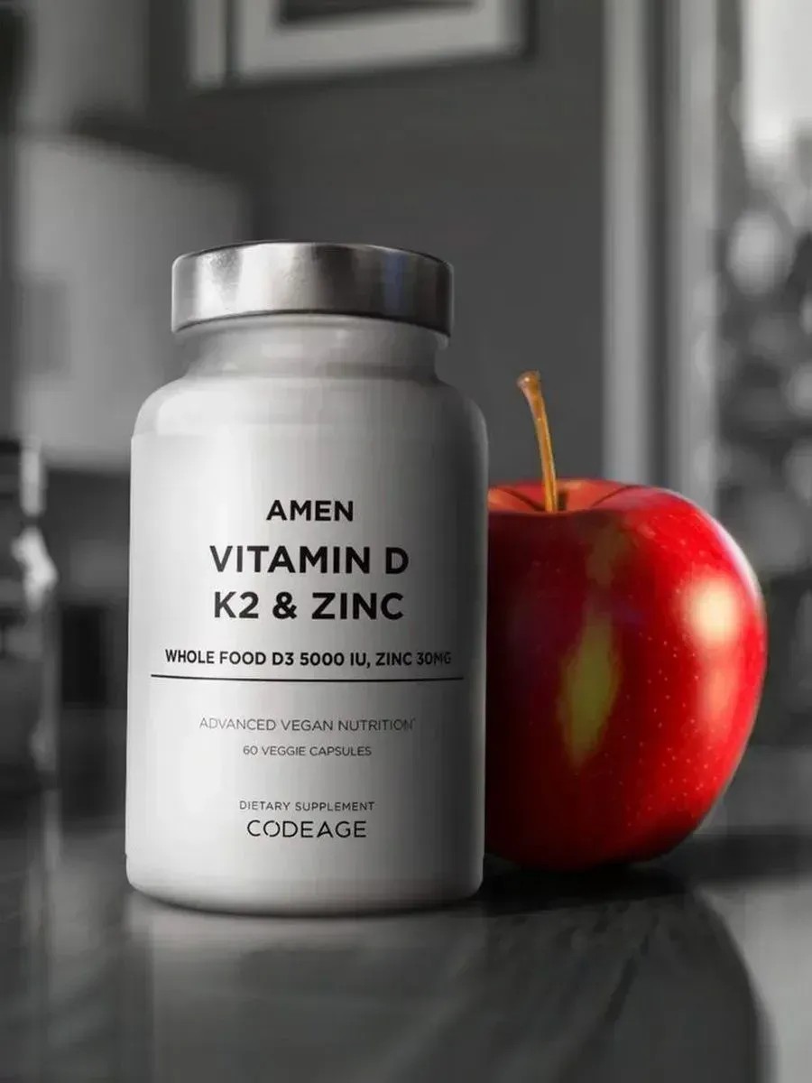 Добавка Amen Vitamin D, Zinc & K2, 60 капсул, представляет собой комплексный продукт, содержащий витамины D3, K2 и цинк, а также органическую смесь из порошка яблока, черники, клюквы и бузины. Каждая капсула содержит витамина D3 в виде холекальциферола, 30 мг цинка в виде аминокислотного хелата и витамина K2 (MK-4 и MK-7). Эта добавка удобна в применении, всего 1 капсула в день, и хватает на 2 месяца. Она не содержит ГМО, является веганской и не содержит молочных продуктов, сои и глютена, что делает ее подходящей для кето-диеты. Витамины D3, K2 и цинк Amen производятся в США на сертифицированном предприятии, где контролируются качество и чистота. Добавка с клюквой также может быть полезной для здоровья и хорошего самочувствия, благодаря своим антиоксидантным свойствам, способности поддерживать здоровье сердечно-сосудистой системы и здоровье зубов. Приобретая добавку Amen Vitamin D, Zinc & K2, вы получаете комплексный продукт, который может помочь поддержать ваше общее здоровье и благополучие. Рекомендуемое применение: Принимайте по 1 капсуле в день, запивая 250 мл воды или вашего любимого напитка. Можно принимать независимо от приёма пищи. Внимание: не превышайте рекомендуемую дозировку. Пожалуйста, будьте осторожны, если у вас есть аллергия или чувствительность к любому из перечисленных ингредиентов. Хранить в недоступном для детей и домашних животных месте. Хранить в сухом прохладном месте, вдали от источников тепла и влаги. Используйте этот продукт только в качестве пищевой добавки. Не используйте для снижения веса.