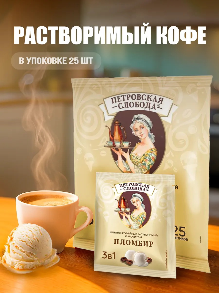 Plombir in flavor, coffee at its core. Petrovskaya Sloboda 3-in-1 Plombir is a dessert and a morning invigorating drink in one cup. The legendary taste of creamy ice cream harmoniously combines with the rich coffee aroma, creating a unique, memorable moment of pleasure. The instant formula allows you to prepare coffee in seconds—just open the stick, add hot water, and enjoy. The convenient 25-serving package is ideal for both home and office. Every sip is like a breath of inspiration: bright, delicate, and enveloping. Soft cream and subtle sweetness reveal the classic taste of coffee in a new light. 3-in-1 Plombir coffee is perfect for those who love variety but aren't ready to sacrifice quality and comfort. Thick but not heavy, light but full of character. Petrovskaya Sloboda is for when you want more than just coffee. The perfect choice for those with a sweet tooth, connoisseurs of mild flavors, and anyone looking for a unique coffee twist. A morning ritual that brings joy every day. Instant coffee with the aroma of ice cream for warmth, comfort, and a great mood.