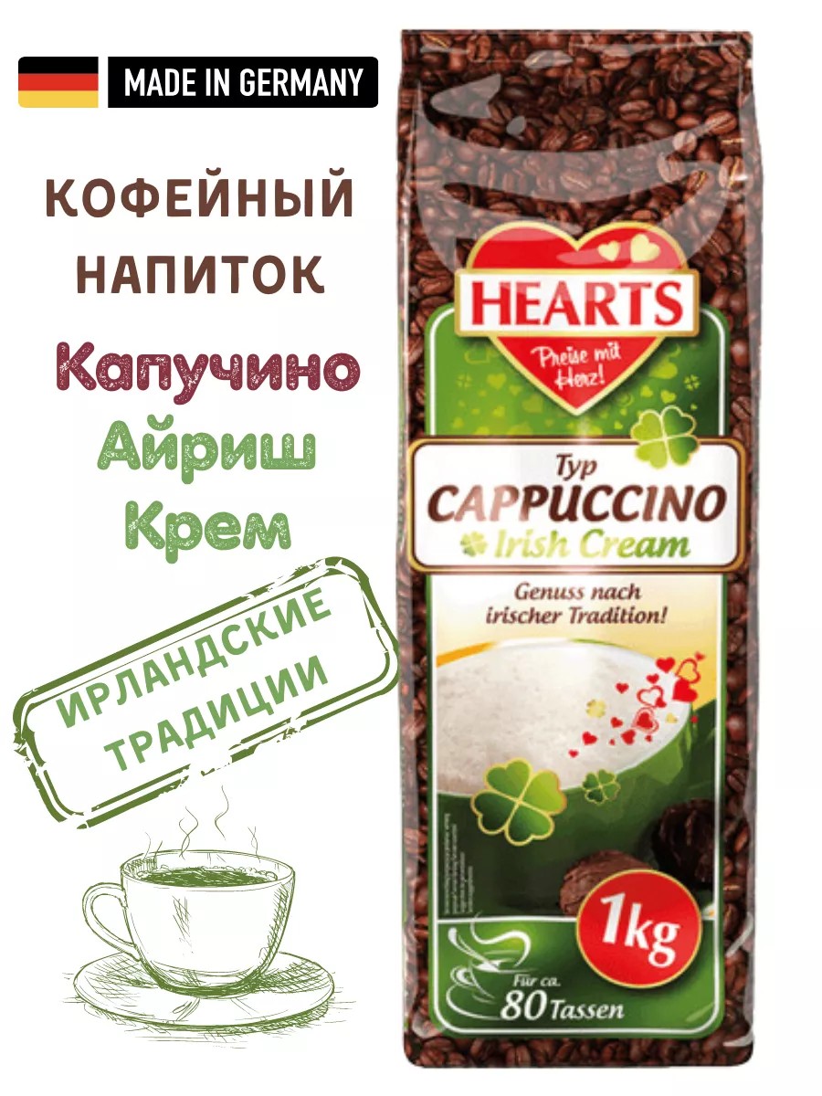 For cappuccino lovers, we present Hearts Cappuccino Irish Cream, a tempting blend of instant coffee and exquisite flavor. Made in Germany. Choose Hearts Cappuccino to suit your taste. Whether it's breakfast or evening coffee, a birthday or a party, this coffee drink is perfect for any occasion. If you're looking for cappuccino in bags, consider Hearts Cappuccino Irish Cream in a convenient and economical 1000g package. One pack makes up to 80 cups of aromatic drink with thick, velvety milk foam, coffee cream, and instant coffee—a delightful combination in a single 1kg cup of Hearts Cappuccino Irish Cream. If you're looking for a gift, you should definitely check out our store. We supply only fresh, original European products.