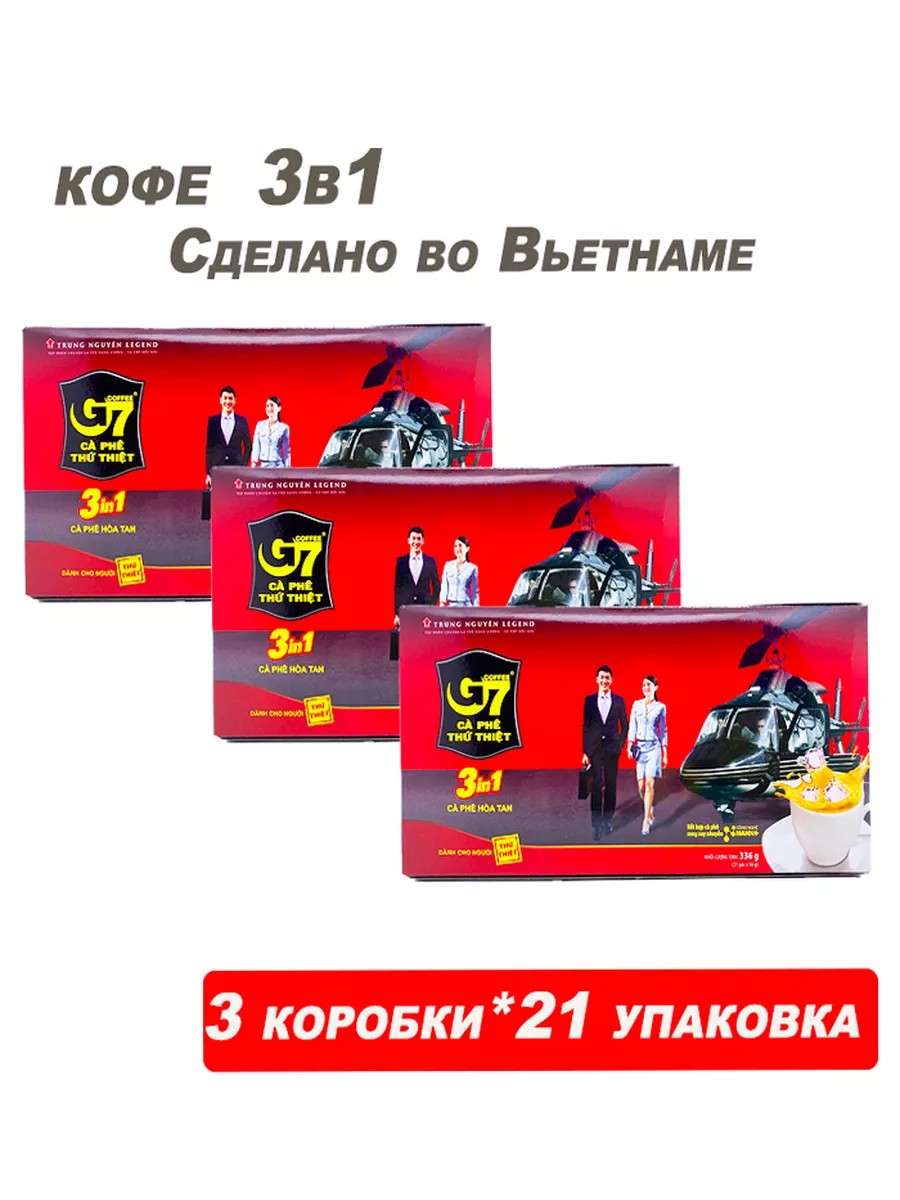 Растворимый кофе TRUNG NGUYEN G7 3 in 1 - флагман в линейке растворимого кофе от крупнейшей вьетнамской кофейной компании TRUNG NGUYEN. В обширном перечне растворимого кофе G7, данная позиция является самым ярким представителем классического вьетнамского растворимого кофе. Входящие в состав растительные сливки гипоаллергенны и могут быть рекомендованы людям с нарушениями иммунной системы. Кофе, произведенный для внутреннего рынка Вьетнама и знакомый многим тем, кто побывал во Вьетнаме и прочувствовал все райские моменты своего путешествия. Вьетнамцы рекомендуют добавлять два пакетика кофе G7 на одну чашку, для достижение яркого вкуса. В одной упаковке 21 пакетик по 16 грамм. Компания Trung Nguyen, более 25 лет возглавляет вьетнамский рынок кофе и стал популярным брендом на международном рынке. Успех Trung Nguyen является результатом огромных стремлений и длительных творческих усилий. Прежде всего, необходимо упомянуть особенность, отражающуюся в усовершенствовании технологий - разработки NANO в сочетании с восточными и азиатскими традициями обеспечивают идеальный вкус кофейных зерен. Только лучшие зерна отбираются из сортов Арабики КауДат и Робусты Буон Ма Туот. Кофе Вьетнам занимает второе место в Мире по экспорту.