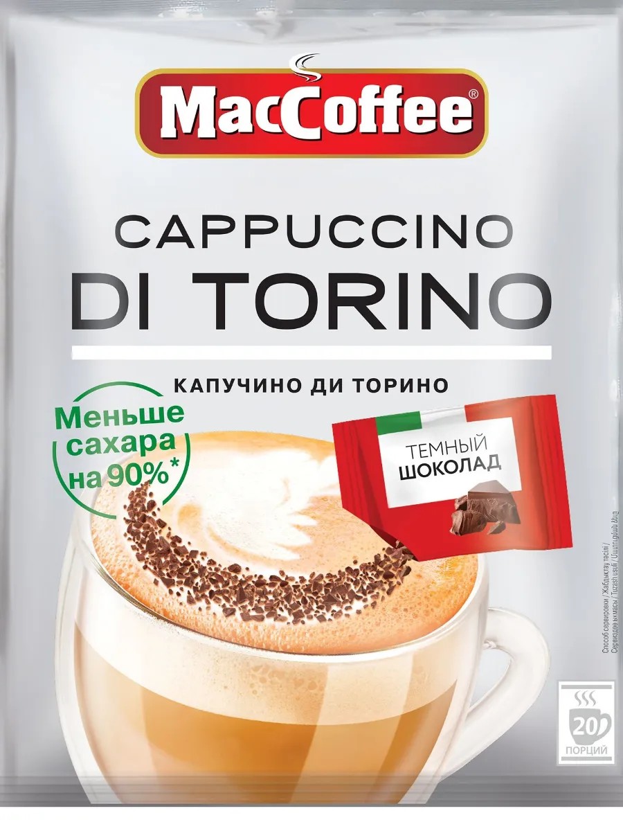 Кофейный напиток МасСoffee Cappuccino Di Torino 3 в 1 с настоящим тёмным шоколадом. Инновация в категории кофейных растворимых напитков с несладким вкусом. Это знаменитая рецептура превосходного капучино с настоящей корицей, изобретенная в городе Турин. Его разработали на основе итальянской рецептуры, соединив вместе кофе, сахар, сливки и добавив к этим ингредиентам ароматный какао.