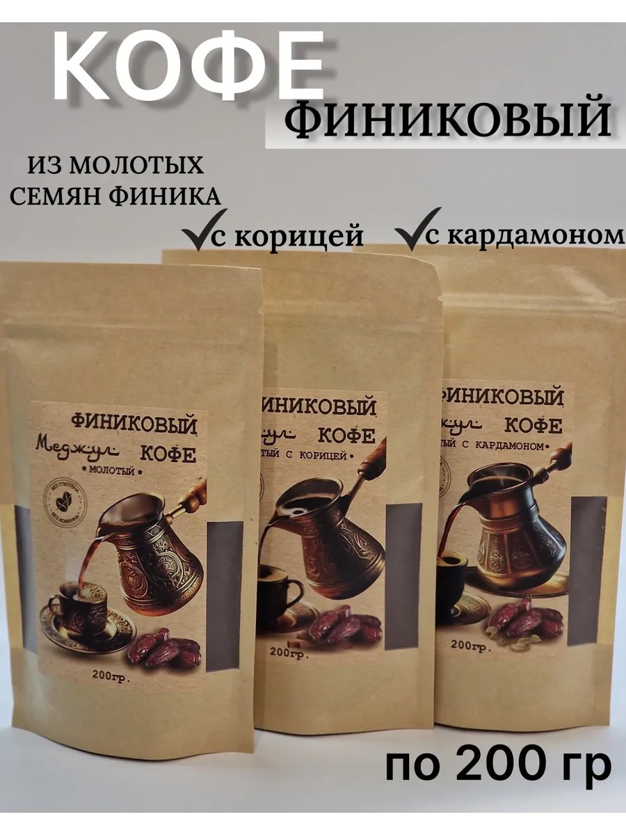Комплектациямолотый финиковый кофе без кофеина свежемолотый 3 штуки с корице,с кардамоном, традиционный