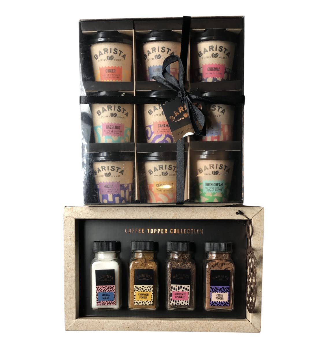 Are you looking for a perfect gift for the coffee lover in your life? Look no further because this gift set is perfect to brighten up the day of a die-hard coffee fan. This makes an ideal Christmas gift, stocking stuffer, festive gift or treat for yourself. Barista Coffee House 9-pack Mini To Go Cups Flavored with Instant Coffee Syrup consisting of Irish Cream, Salted Caramel, Vanilla, Cappuccino, Latte, Hazelnut, Original Coffee, Ginger, and Mocha. Barista 4-pack Flavored Coffee Decorations Powder and Chocolate Sprinkles consisting of Vanilla, Cinnamon Sugar, Chocolate Powder, and Cocoa Powder. DIRECTIONS FOR USE Open the product, add hot water, sprinkle your desired topping, stir, and enjoy.Ready to use: Just wrap it, slip it into a bag, and this gift set is ready to use. Just add hot water, sprinkle, and enjoy. The 4-pack of coffee toppers contains 60g vanilla sugar, 30g cinnamon powder, 45g chocolate dusting, and 25g cocoa powder. The Barista Coffee House Mini To Go Cup Instant coffee flavors consisting of Irish Cream, Vanilla, Caramel, Cappuccino, Latte, Hazelnut, Original Coffee, Ginger, and Mocha 18g each. This pack includes a Barista Coffee House Mini To Go Cup (9 cups) and a Barista Coffee To Go Collection (4 packs). With this variety, your loved ones can enjoy exploring different coffee flavors and toppers. Vous êtes à la recherche d'un cadeau parfait pour les amateurs de café dans votre vie ? Ne cherchez plus car ce coffret cadeau est parfait pour égayer la journée d'un ventilateur de café dur. Cela est un cadeau de Noël idéal, un cadeau de Noël, un cadeau festif ou un cadeau pour vous-même. Barista Coffee House Lot de 9 mini tasses à emporter aromatisées au sirop de café instantané composé de crème irlandaise caramel salé à la vanille cappuccino latte noisette original café, gingembre et moka Barista Lot de 4 décorations de café aromatisées en poudre et saupoudres de chocolat composé de vanille, sucre cannelle, poudre de chocolat et poudre de cacao MODE D'EMPLOI Ouvrez le produit, ajoutez de l'eau chaude, saupoudrez la garniture souhaitée, remuez et profitezPrêt à l'emploi : il suffit de l'envelopper, de le glisser dans un sac, et ce coffret cadeau est prêt à l'emploi. Il suffit d'ajouter de l'eau chaude, de saupoudrer et de profiter. Le lot de 4 décorations de café contient du sucre vanille 60 g, de la poudre de cannelle 30 g, de la saupoudrage de chocolat 45 g et de la poudre de cacao 25 g. The Barista Coffee House Mini tasse à emporter Saveurs de café instantanées composée de crème irlandaise, vanille, caramel, cappuccino, latte, noisette, café original, gingembre et moka 18 g chacun. Ce lot comprend une mini tasse à emporter Barista Coffee House (9 tasses) et une collection de décorations de café Barista (4 paquets). Avec cette variété, vos proches peuvent profiter d'explorer différentes saveurs et décorations de café.