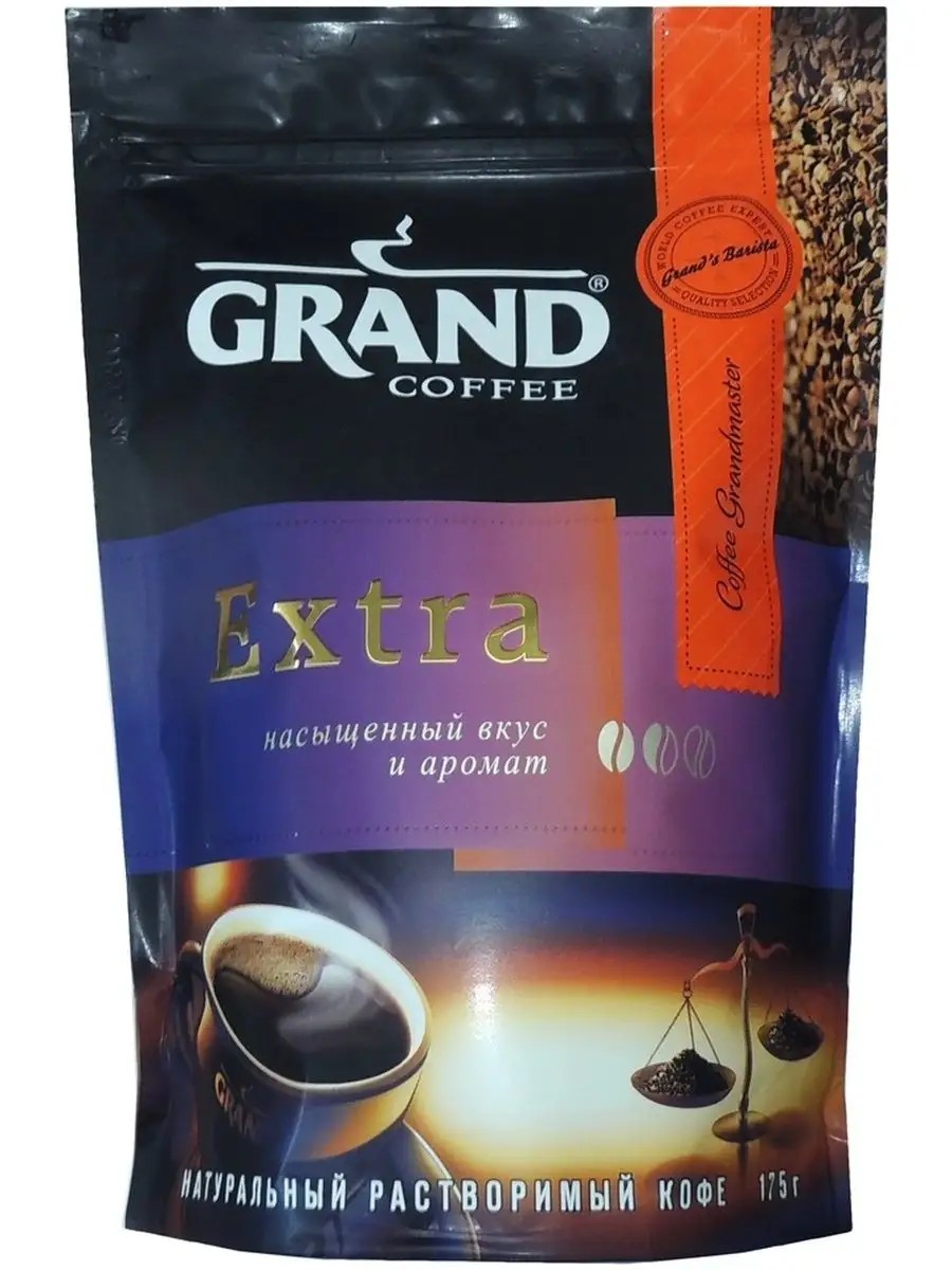 Grand Extra Coffee 175 grams, doypack. Grand Extra instant freeze-dried coffee is 100% natural, created according to a special GrandMaster Barista recipe to give you the taste and aroma of freshly brewed coffee. With it, you'll experience the vibrant palette of a dark roast of high-quality coffee beans, which maximally reveals the coffee's character and imparts a rich, full-bodied taste with bold notes of astringency and a pleasant bitterness. Thanks to Grand Extra coffee's convenient instant format, you can enjoy an invigorating drink any time of day and anywhere.