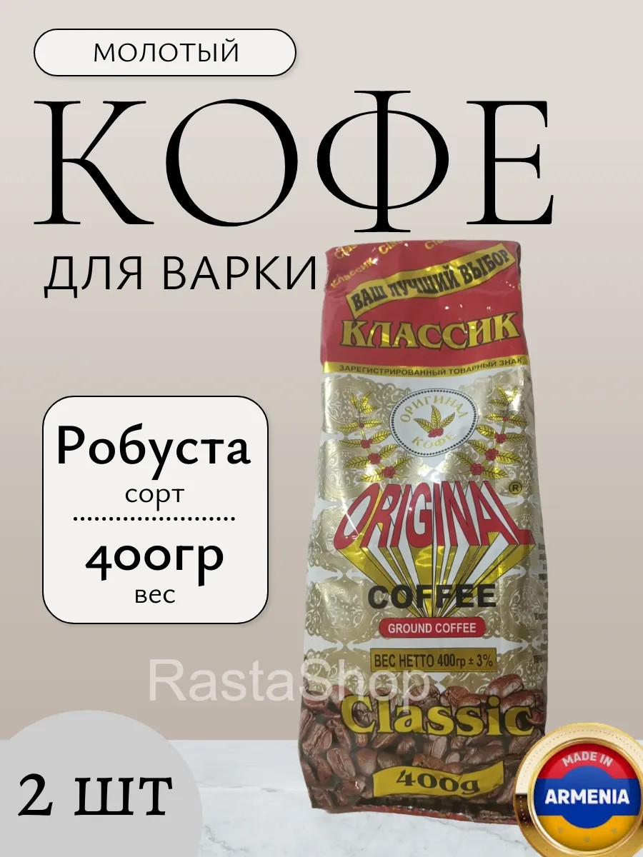 Classic Original ground coffee is the ideal choice for lovers of a rich and invigorating taste. This 100% Robusta coffee will give you a boost of energy for the entire day. Its rich aroma and full-bodied flavor are fully revealed when prepared in a Turkish coffee pot, creating the unique atmosphere of an Eastern ritual. This coffee is made from Robusta beans grown in various parts of India. Preparation: Add sugar and water to one spoon of ground coffee and bring to a boil. Two 400-gram packages will allow you to enjoy your favorite drink for a long time.