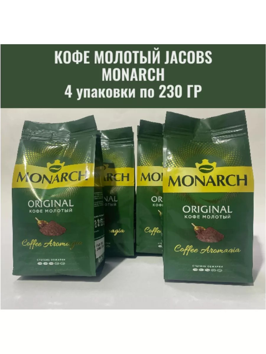 Молотый Кофе Якобс Monarch Оригинал 4 упаковки по 230 гр - обладает богатым вкусом и притягательным ароматом благодаря искусному сочетанию отборных кофейных зёрен и глубокой обжарке.