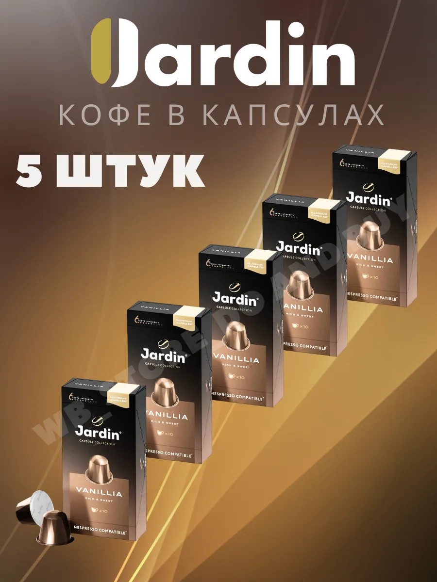 50 capsules, great deal!!! JARDIN Vanillia Nespresso capsules are a blend of Arabica beans from Guatemala and Colombia with vanilla. This coffee has a velvety aroma and a long, sweet aftertaste. Ingredients: roasted and ground coffee, vanilla. Medium roast. Gift set, Sweet taste, hot drink, for friends, for family, sweet box. Jardin is a premium coffee brand offering a wide collection of exquisite coffee varieties. Many people ask us: Why are Jardin Nespresso capsules made of aluminum? Is this important or not? We answer that this not only gives them a stylish appearance but also makes them 100% recyclable, unlike plastic coffee capsules. In addition, they better preserve the coffee aroma of freshly ground Jardin coffee. The Jardin brand has long and successfully produced and sold various types of coffee capsules for Nespresso machines—Arabica, Arabica, and Robusta, as well as ground coffee with flavor additives such as vanilla. Unlike many other coffee machine capsule manufacturers, Jardin coffee capsules taste very similar to original Nespresso products. This was determined by blind tests conducted by coffee experts and coffee lovers, unlike other capsules, where the flavor is often weak and seemingly diluted. Order and experience the variety of flavors and aromas of Jardin coffee capsules. Country of origin: Russia.