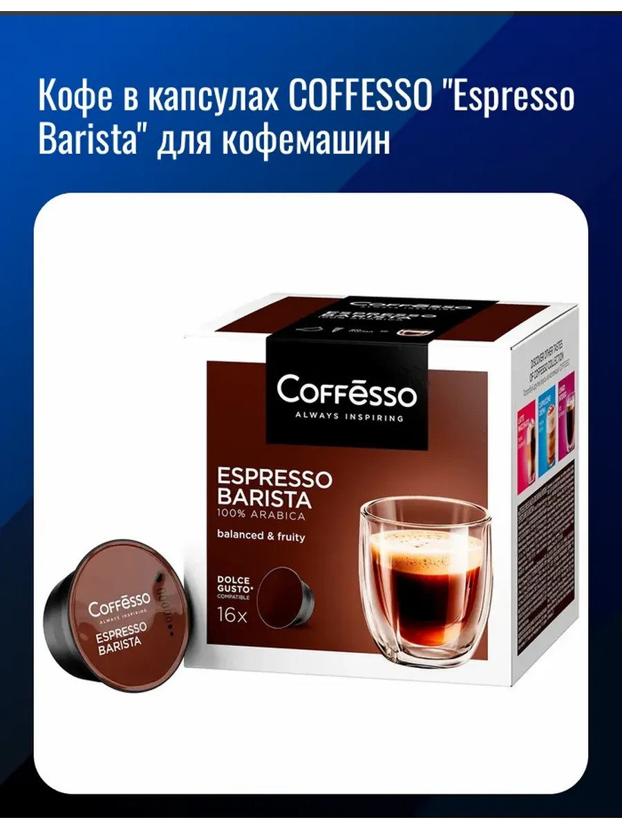 Количество упаковок: 1 шт., Количество в упаковке: 1 шт., COFFESSO "Espresso Barista" порадует вас невероятной сбалансированностью и плотностью вкуса.Состав: кофе жареный молотый, 100% арабика.. Вид капсульной системы: Dolce Gusto; Вид напитка: кофе в капсулах; Степень обжарки: средняя; Количество кофейных капсул в упаковке: 16 шт.; Количество шоколадных капсул в упаковке: 0 шт.; Количество молочных капсул в упаковке: 0 шт.; Тип кофе: в капсулах; Вкус: с фруктовыми нотами; Вес кофейной капсулы: 9 г; Вес шоколадной капсулы: 0 г; Вес молочной капсулы: 0 г; Срок годности: 18 мес.; Фирма-производитель: ООО МАЙ