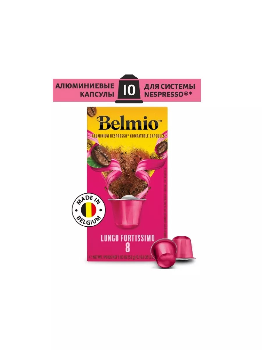 Кофе Belmio Lungo Fortissimo (intensity 8) представлен в капсулах из экологически безопасного алюминия, который сохраняет аромат молотых зерен. Средняя обжарка способствует получению яркого, в меру крепкого и насыщенного вкуса. При приготовлении напитка сверху образуется мягкая кофейная пенка. Страна производства — Бельгия. В составе присутствует 100% «Арабика». Набор состоит из 10 капсул, совместимых с кофемашинами Nespresso. Объем готового напитка равен 110 мл.