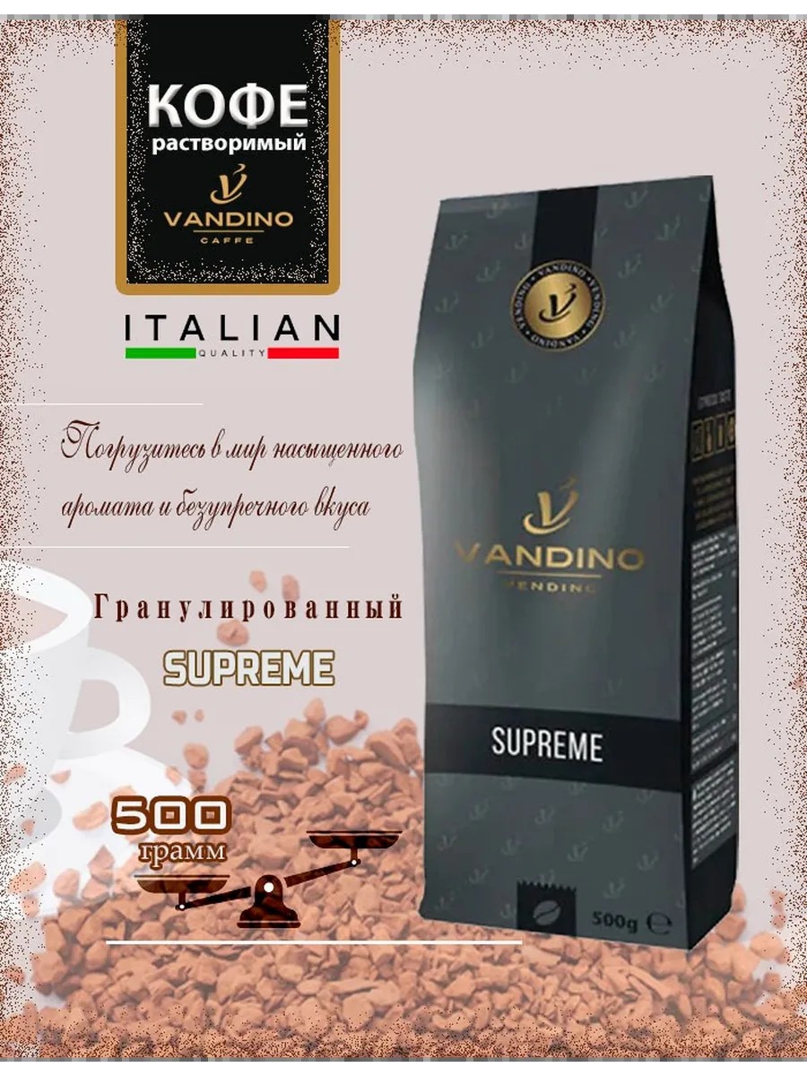 Растворимый гранулированный кофе VANDINO Supreme, 500 г – Высший стандарт вкуса из Италии .Погрузитесь в мир насыщенного аромата и безупречного вкуса с VANDINO Supreme - растворимым гранулированным кофе премиум-класса. Созданный специально для ценителей настоящего кофе, он сочетает в себе глубину вкуса, легкость приготовления и высокую эффективность.