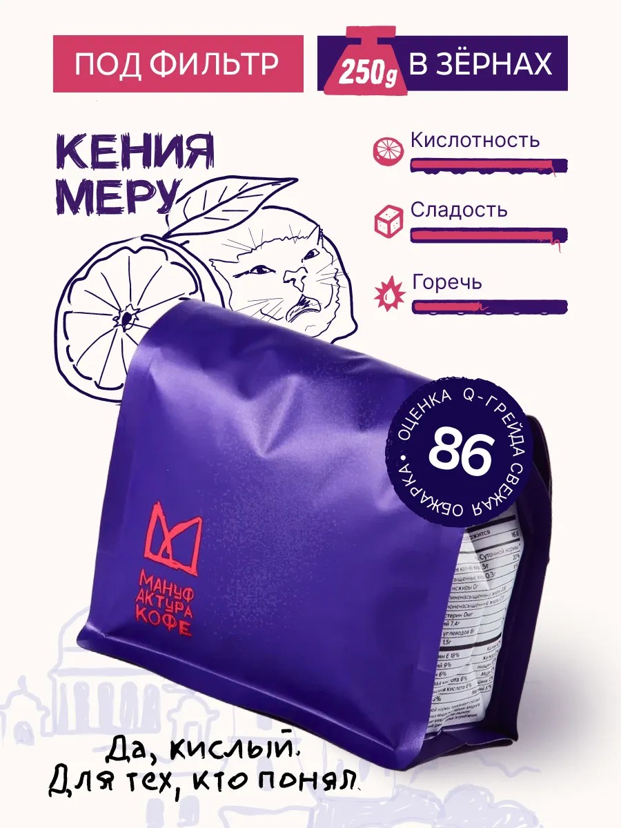 Мануфактура кофе, фильтр обжарка. Кофе зерновой Кения Меру 250 г — это истинное наслаждение для ценителей качественного напитка. Этот ароматный и сочный кофе из 100% арабики с кенийского высокогорья подарит вам уникальные вкусовые ощущения. Зерно обжарено специально под фильтр, чтобы сохранить максимум яркости, фруктовости и кислотности в каждой чашке. Кения Меру — это идеальный выбор для тех, кто ценит насыщенные и нетривиальные вкусы. Во вкусе вы ощутите ноты малины, лёгкие специи, вяленые томаты и карамельно-фруктовую сладость, напоминающую петушков на палочке. В послевкусии остаётся приятная фруктовая кислинка и натуральная сладость без горечи. Этот зерновой кофе раскрывается наилучшим образом при использовании альтернативных методов заваривания: V60, Chemex, Kalita или френч-пресс. Также он отлично подходит для заваривания в турке или моке. Это идеальный вариант для тех любителей кофеина, кто любит открывать новые тонкие нюансы во вкусах. Пачка объёмом 250 г — это удобный формат как для домашнего использования так и для путешествий или подарков близким людям. Вакуумная упаковка с дегазационным клапаном и зип-замком гарантирует сохранение свежести вашего любимого напитка до последней чашки. Если вы ищете что-то особенное среди множества предложений на рынке кофейной продукции — этот продукт именно то что вам нужно! Он не только порадует вас своим вкусом но также станет отличным дополнением к вашему утреннему ритуалу или вечернему отдыху.