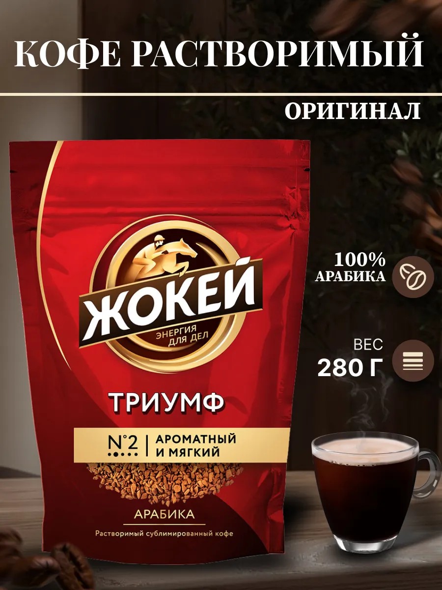 Сублимированный растворимый кофе с мягким вкусом и ярким ароматом. Кофейный бленд созданный изотборных сортов различных регионов.Жокей Триумф отличается мягким, хорошо сбалансированным вкусом и ярким ароматом.
