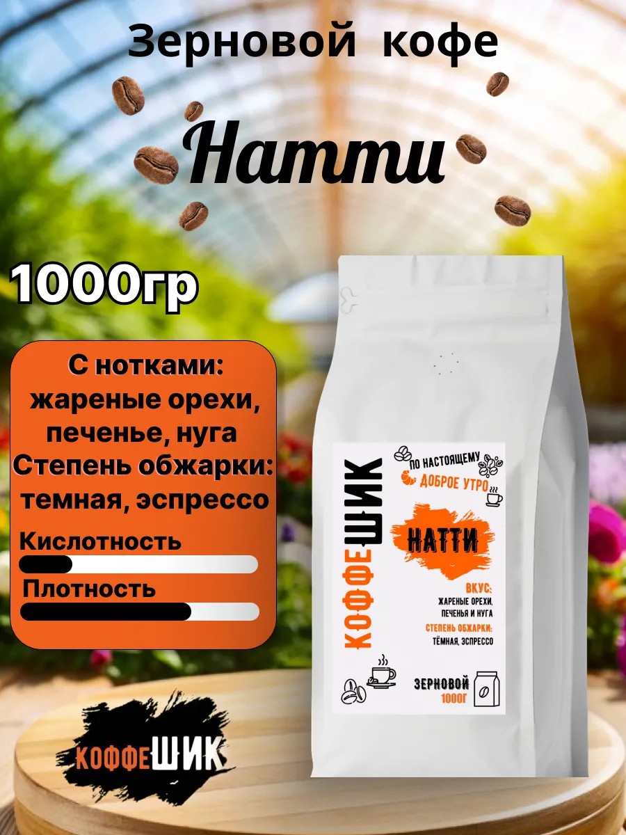 Свежеобжаренный зерновой кофе Натти создан для молочных напитков, имеет сладкий и плотный аромат с средней кислотностью.