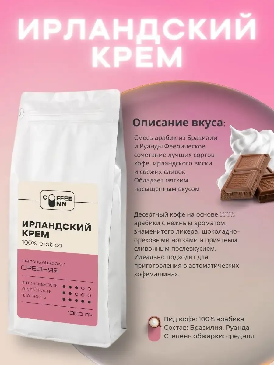 Кофе в зернах 1 кг 'Ирландский крем' от COFFEE INN представляет собой идеальный выбор для любителей кофе, предпочитающих мягкий и средненасыщенный вкус. Этот ароматизированный кофе из 100% арабики Бразилия подходит для ежедневного употребления по утрам, обеспечивая приятный старт дня. Средняя степень обжарки придает зернам уникальный баланс между ароматом и вкусом, делая его универсальным выбором для любителей кофе. Свежербжаренные натуральные зерна гарантируют максимальную свежесть и насыщенность вкуса. 'Ирландский крем' от COFFEE INN - это не просто кофе, это настоящее удовольствие для ваших утренних часов.