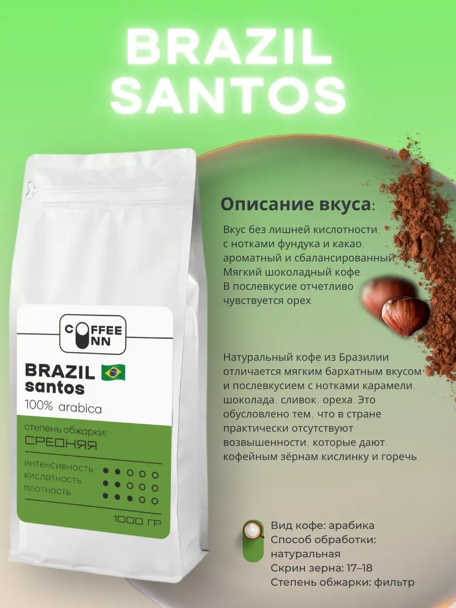 Brazil Santos - 100% Arabica Flavor : The flavor is without excess acidity, with notes of hazelnut and cocoa, aromatic and balanced. A soft, chocolatey coffee. The aftertaste is distinctly nutty. Origin and Features: The first coffee bushes were planted in Brazil in 1727 in what is now the state of Pará. Brazil is the largest Arabica producer in the world, accounting for almost a third of global production. This variety takes its name from the port of Santos, from which the coffee is shipped. Natural coffee from Brazil is distinguished by a soft, velvety taste and an aftertaste with notes of caramel, chocolate, cream, and nut. This is due to the country's virtually lack of elevated altitudes, which impart acidity and bitterness to coffee beans. Coffee type: Arabica Processing method: natural Grain size: 17–18 Growing altitude: 850–1100 meters above sea level Roasting roaster: Probat G120H Roasting level: filter