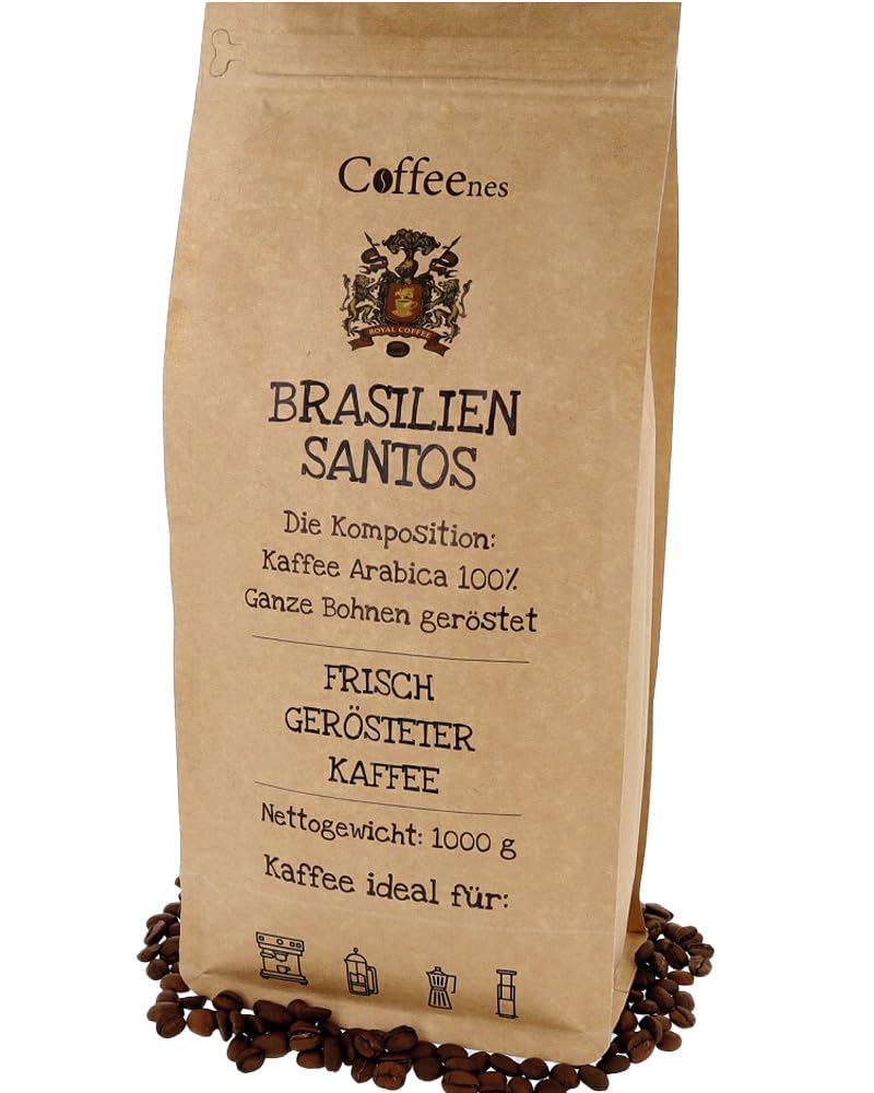 Coffeenes Arabica Kaffeebohnen 1 kg - Kaffee Ganze Bohnen - Bohnenkaffee - Körper (Fülle) – 3 5, Säuregehalt – 1 5, Aroma – 4 5 BRASILIEN SANTOS