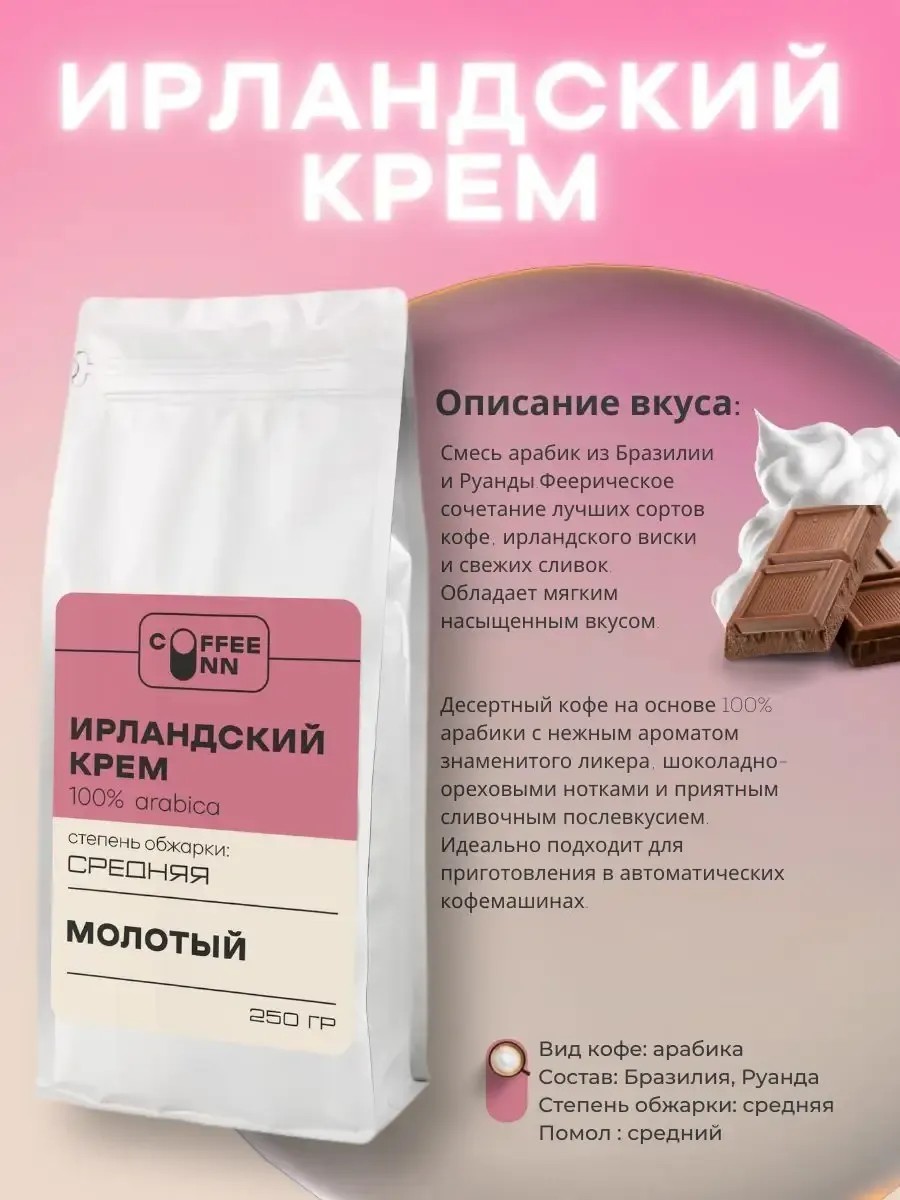Set contents: Irish Cream, French Vanilla, Bavarian Chocolate, Ground Irish Cream, Flavored, 750g - 100% Arabica. A blend of Arabicas from Brazil and Rwanda. A magical combination of the finest coffees, Irish whiskey, and fresh cream. It has a soft, rich flavor. Dessert coffee made from 100% Arabica beans with the delicate aroma of the famous liqueur, chocolate-nutty notes, and a pleasant creamy aftertaste. Ideal for automatic coffee machines. A classic dessert coffee. The delicate, velvety flavor of the beans combined with the distinctive aroma of dark chocolate create a unique taste. To create this flavored coffee, we used high-quality aromatic blends containing natural ingredients and extracts to give the drink an even deeper and richer flavor. Store in a cool, dry place at a temperature not exceeding 25 degrees and a relative humidity not exceeding 75% in a tightly closed package.