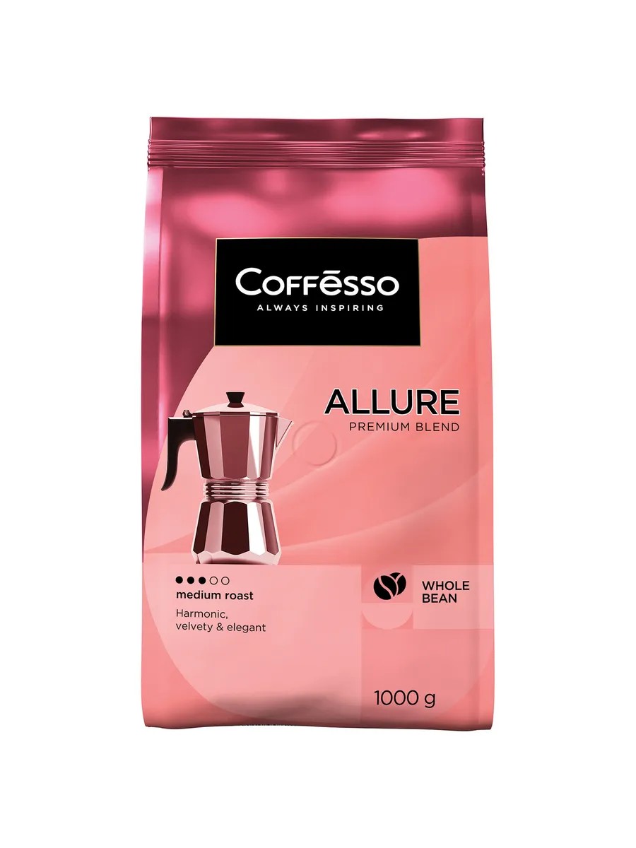 COFFESSO "Allure" coffee beans, 1 kg, 102487 A velvety blend of Brazilian Arabica with the addition of Vietnamese Robusta will reveal a whole bouquet of bright shades in the taste, combined with a pleasant density and a long aftertaste. Ingredients: a mixture of Arabica and Robusta. Net weight: 1000 g. Roasting degree: medium. Bean variety: a mixture of Arabica and Robusta. Coffee type: whole grain. Shelf life: 18 months. Taste: Allure. Manufacturer: MAY LLC. Packaging: doy-pack Brand - COFFESSO. Manufacturer - Russia. Article - 102487. Barcode - 4660115908217. Food. Coffee
