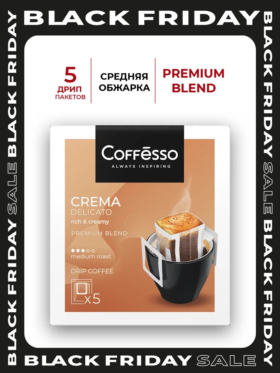 Команда экспертов Coffesso создала уникальные бленды, которые превращают каждую минуту с чашкой кофе в нечто большее, чем просто перерыв. Это вдохновение, развитие вкуса и эстетическое удовольствие. Кофе молотый в дрип пакетах Crema Delicato (5 пакетиков по 9 грамм) станет отличным подарком на любой праздник. Это не просто подарочный кофе, это приглашение насладиться истинным кофейным искусством вместе с Coffesso. Откройте для себя новые грани вкуса и наслаждайтесь каждым глотком, ведь Coffesso – это ваш проводник в мир кофейного совершенства. Coffesso — это импульс, открывающий тебя новому в жизни, что приносит удовольствие, и делает её многогранной.