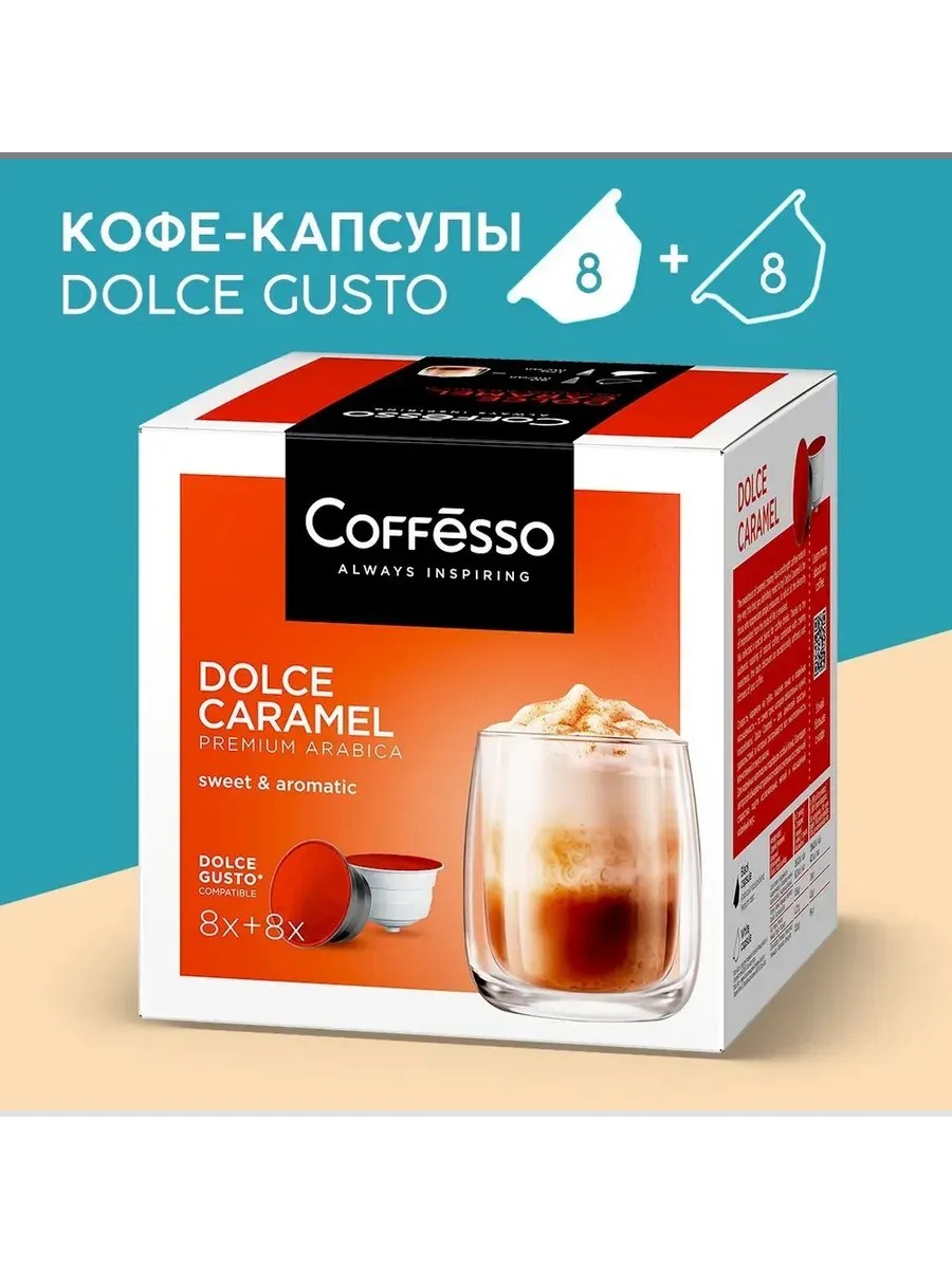 COFFESSO капсулы . Откройте для себя мир изысканного вкуса с капсулами для кофемашины Dolce Gusto. Dolce Caramel превратит ваш кофейный ритуал в настоящее сладкое удовольствие, даря неповторимые мгновения наслаждения. В каждой капсуле - симбиоз богатого кофейного аромата, нежной молочной пены и ласкового карамельного акцента, который призван удовлетворить истинных гурманов.