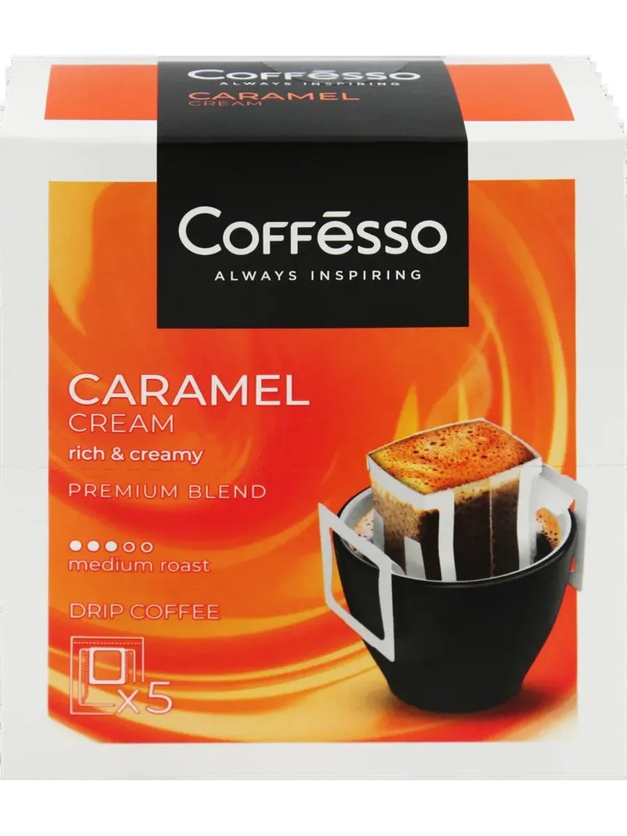 COFFESSO Caramel Cream ground roasted coffee. The caramel aroma and rich coffee note will provide a long-lasting sweetness and tenderness of your favorite drink, which you can enjoy anywhere – at home, in the office, or while traveling. Coffee in drip bags is for those who want the ultimate experience. Plus, it's now as easy as one, two, three – open, insert, pour – and you're done.