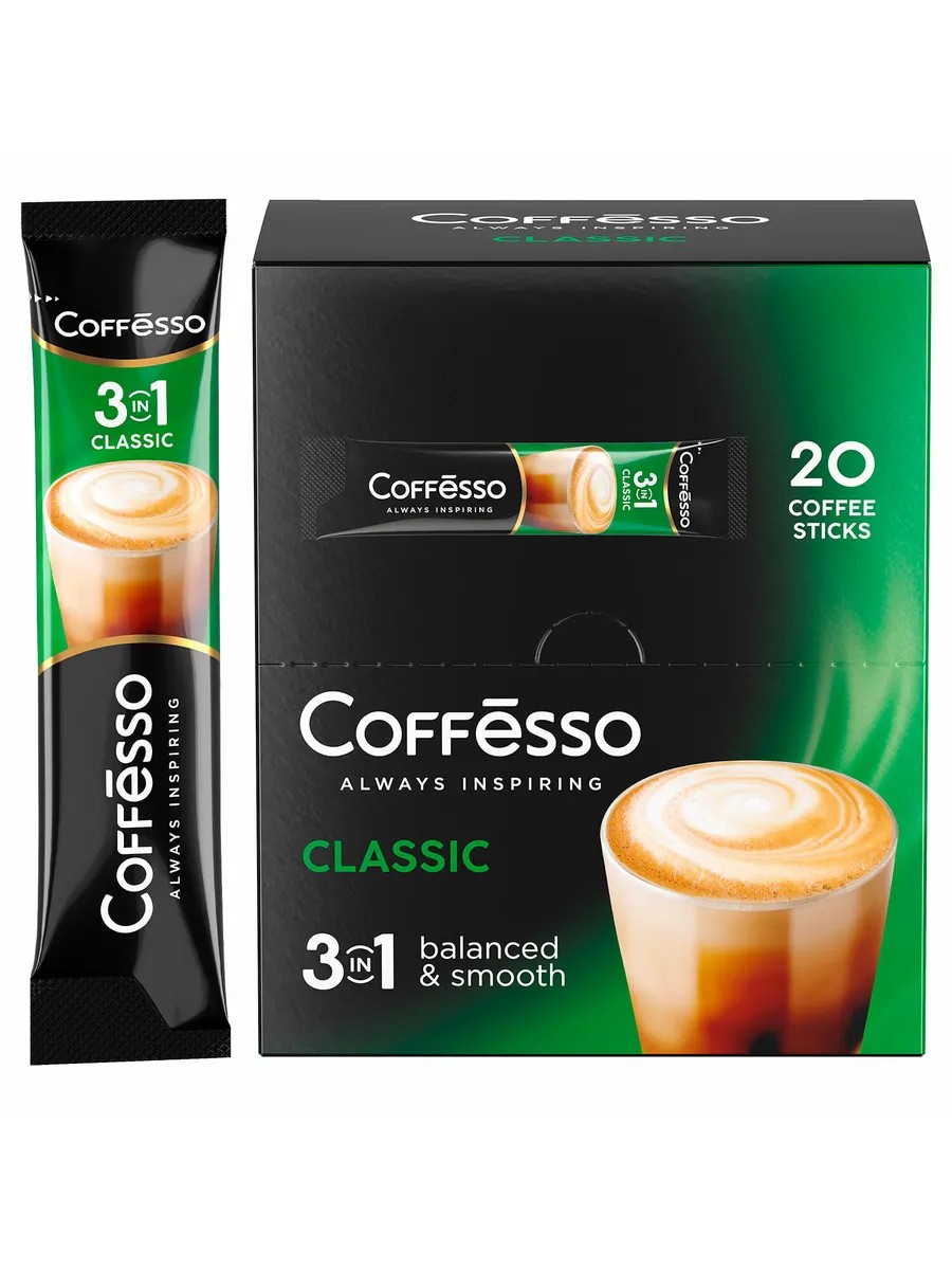 COFFESSO "3 in 1 Classic" instant coffee, 15 g sachet, 102147 COFFESSO "3 in 1 Classic" is a classic soft taste with an ideal balance of coffee and milk for a pleasant coffee break and an easy start to the day. 20 capsules. Ingredients: sugar, plant-based creamer, natural instant coffee, caramel flavoring, salt. Non-GMO, no dyes. Nutritional value per 100 g: proteins - 4.51 g, fats - 9.5 g, carbohydrates - 82 g. Energy value per 100 g - 432 kcal. Storage conditions: store at a temperature of 0 to +25 ° C. Coffee type: instant. Series: COFFESSO. Taste: Classic. Weight: 15 g. Portioned in sachets: yes. Packaging: bag Brand - COFFESSO. Manufacturer - Russia. Article - 102147. Barcode - 4660115907821. Food. Coffee.
