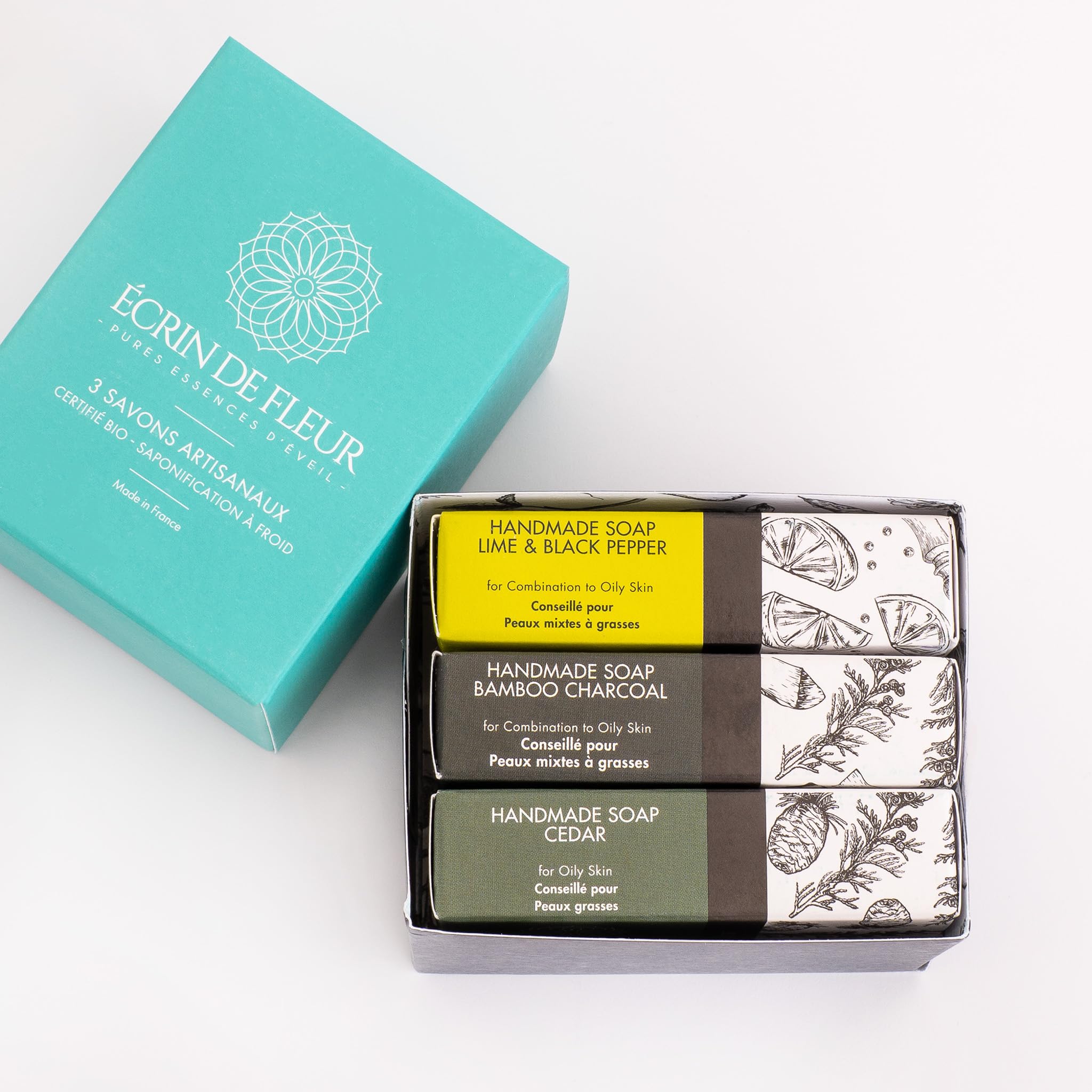 Écrin de Fleur – Certified Organic Men's Soap Gift Set The perfect blend of nature and artisanal craftsmanship – Made in France Discover the ultimate grooming essentials with the Écrin de Fleur 3-Piece Organic Men's Soap Set. This luxurious collection includes three handcrafted soaps made with organic ingredients, offering the ideal combination of natural skincare and French artisanal expertise. Perfect for daily cleansing and detoxification, this gift set is a thoughtful present for any man who appreciates premium and sustainable grooming products. What's included in the set: Cedarwood Soap: Infused with organic cedarwood and patchouli essential oils, this soap offers a soothing, woody, and earthy fragrance while gently cleansing and moisturizing the skin. Lime and Black Pepper Soap: A revitalizing blend of lime and black pepper essential oils creates a refreshing and energizing aroma to uplift your senses. Ideal for starting the day with a boost of energy. Charcoal and Cedar Soap: Made with activated charcoal and cedarwood essential oils, this detoxifying soap deeply cleanses the skin, leaving it smooth, refreshed, and rejuvenated. Key Features: Premium Organic Ingredients: Each soap is made with certified organic oils and pure essential oils, ensuring gentle and effective care for all skin types. Handcrafted Quality: Handmade in France using traditional soap-making techniques for a perfect blend of heritage and luxury. Versatile Benefits: Designed for hands, face, and body, this collection offers cleansing, detoxifying, and invigorating properties. Eco-Friendly Packaging: Elegantly packaged in recycled materials. Safety Warning: Avoid contact with eyes. If contact occurs, rinse with water.