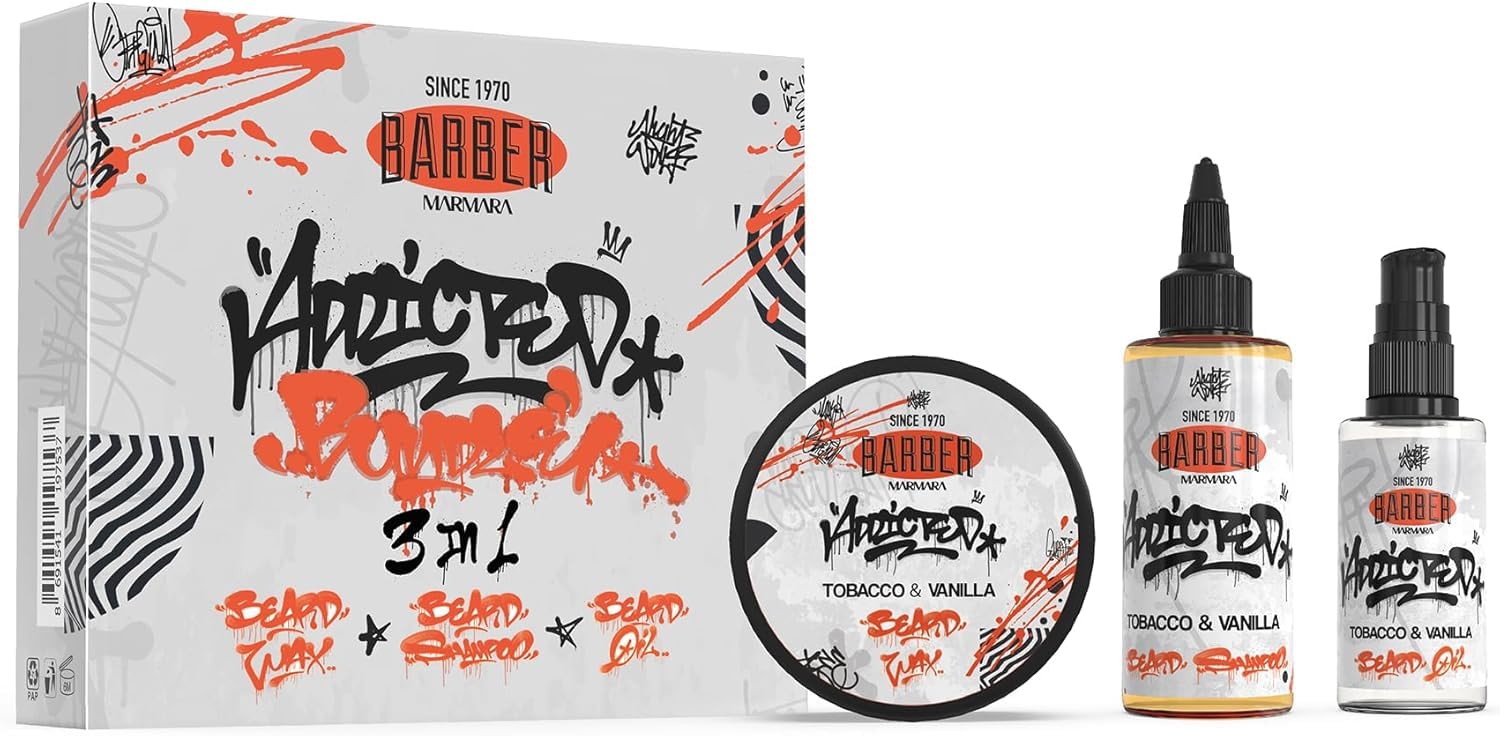 PERFECT GIFT FOR MEN - Ideal for anyone with a beard or mustache, or who's thinking about growing one. This travel kit contains all the beard care and styling products you need. BARBER BEARD WAX - Allows you to shape your beard as desired and ensures long-lasting hold. It preserves the natural look of your beard and doesn't create excessive stiffness. BARBER BEARD SHAMPOO - Gently cleanses your beard and skin, effectively removing dirt and buildup. Its easy-to-use, lightly lathering formula cleanses your beard. BARBER BEARD OIL - Deeply moisturizes your beard and skin, prevents dryness and itchiness, softens the beard, and provides a smoother appearance. It absorbs quickly and leaves no greasy residue. 3 IN 1 BEARD CARE AND STYLING SET - The ADDICTED beard kit combines all our high-quality beard care products in one set for perfect beard care and styling.