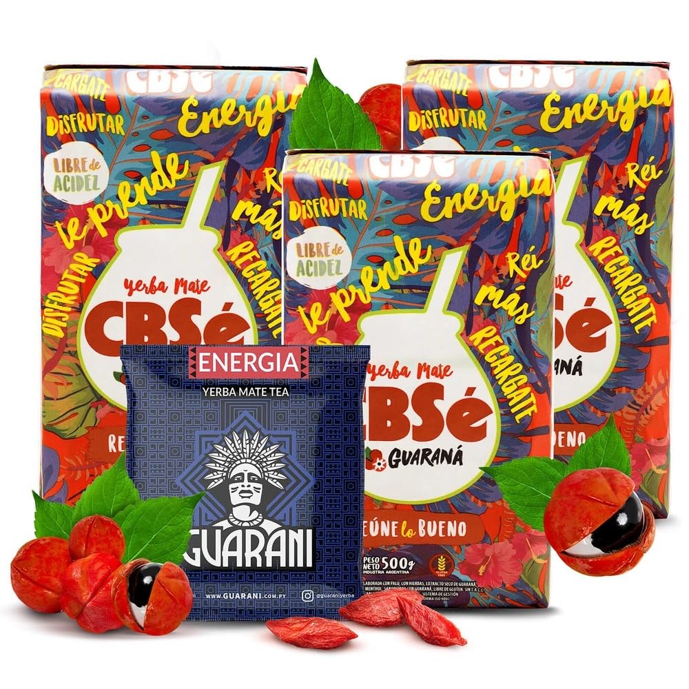 Complete Energizing Gift Set – Includes: 3 x CBSé Energía Guaraná 500g 1 x Guarani Energia con Guaraná 50g Discovery Sample. Perfect for yerba mate lovers or as a wellness gift! Ideal for boosting concentration and performance – recommended for students, busy professionals, and athletes. A natural ally during intense periods of work, study, or physical training. Sweet, Spicy Fruity Flavors – Enchanting aromas with delicately smoky, slightly sweet, and fruity notes, for a pleasant and fragrant infusion, even for beginners. Less bitter than classic yerba mate! Premium 100 South American Blends – Discover two iconic yerba mate brands: CBSé (Argentina) and Guarani (Paraguay), known for their quality, natural flavors, and carefully balanced blends of guarana extract and selected herbs. Powerful Natural Stimulation – Enjoy a triple dose of natural energy with 3 packs of CBSé Energía Guaraná, combined with a generous sample of Guarani Energia (50g). Perfect as a coffee substitute to combat fatigue!