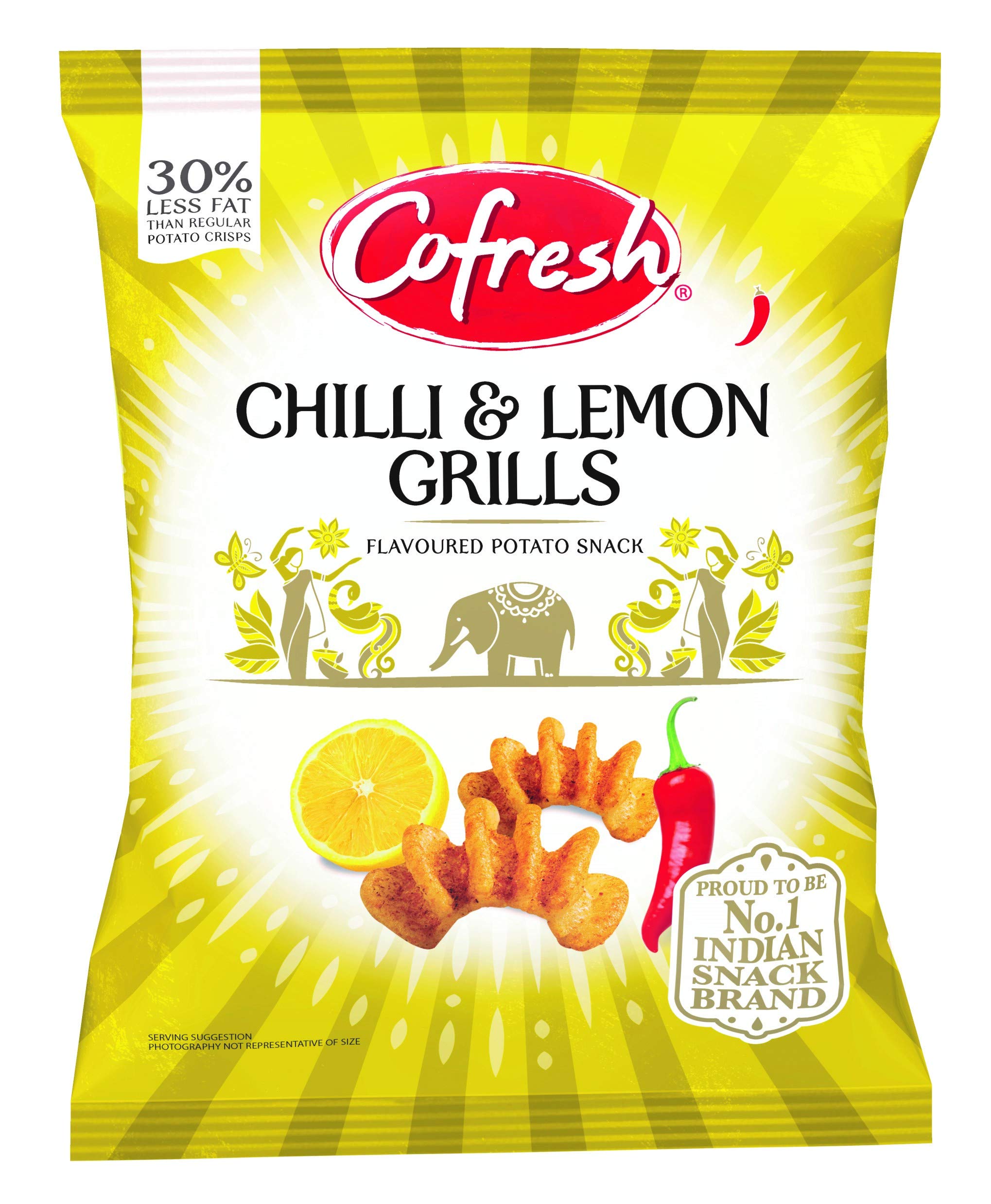 Cofresh Chilli Lemon Flavored Potato Grills are the perfect savory snack for any occasion. They contain no added sugar and are perfect for dipping in your favorite dip. All Cofresh snacks are vegetarian. INGREDIENTS Potato Starch, Solids (40 ), Potato Starch, Vegetable Oil (Chili), Lemon Chili Seasoning (2.5 ) (Salt, Rice Flour, Spices (including Chili), Yeast Extract Powder, Garlic Powder, Onion Powder, Citric Acid, Natural Flavors), Lemon Juice Powder (1 ) (Corn Maltodextrin IP, Lemon Juice), Natural Color (Paprika).