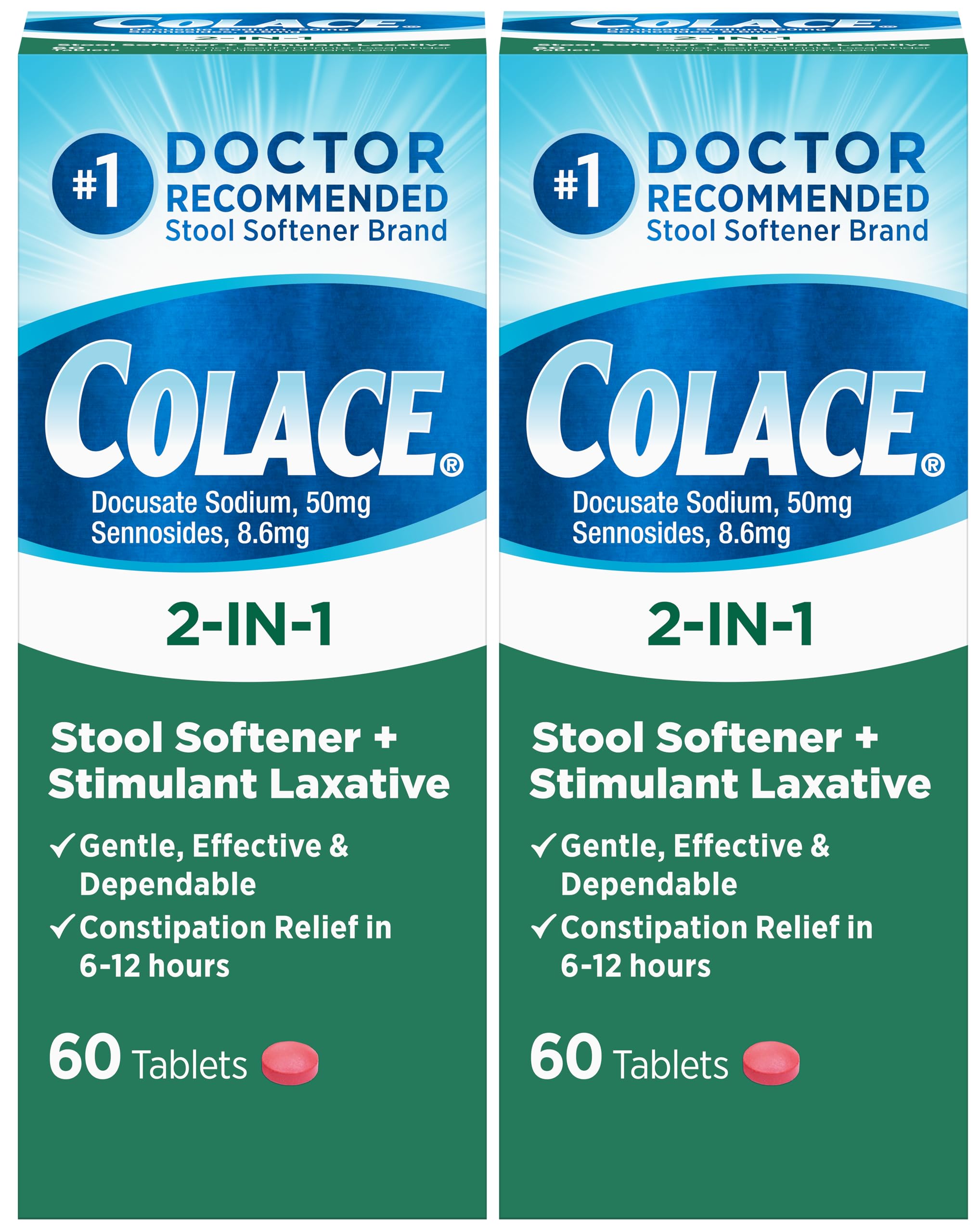 Colace 2-IN-1 Stool Softener Stimulant Laxative Tablets, 60-count. Colace 2-IN-1Tablets contain both a stool softener and a stimulant laxative for comfortable, overnight relief of occasional constipation. Trusted by doctors and patients for nearly 50 years, Colace 2-IN-1 Tablets provide effective, reliable relief from occasional constipation and generally produce bowel movement in 6 to 12 hours. Two ingredients in one easy-to-swallow tablet