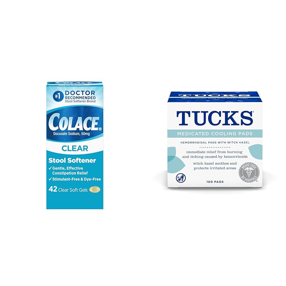 This 42-count bundle combines Colace Clear Stool Softener Capsules and TUCKS Medicated Cooling Pads to provide gentle, effective relief from occasional constipation and hemorrhoid discomfort. The Colace Clear Stool Softener Capsules are doctor-recommended to softly relieve constipation without harsh stimulants or dyes. Each small, easy-to-swallow gel cap contains 50mg of docusate sodium to gently increase water in the stool. Colace is the 1 doctor-recommended brand for comfortable constipation relief during pregnancy, after surgery, or for those with conditions like hemorrhoids. The 100-count TUCKS Medicated Cooling Pads can be used to soothe irritation and discomfort from hemorrhoids, providing immediate relief from burning and itching. The witch hazel-infused pads can also be used after childbirth or rectal surgery. TUCKS pads are pH-balanced, hypoallergenic, ultra-soft, and dye-free. Together, these two products work to relieve occasional constipation discomfort and irritation in a gentle, non-stimulant, doctor-recommended way. The Colace capsules soften stool while the TUCKS pads provide immediate cooling relief from external irritation and discomfort.
