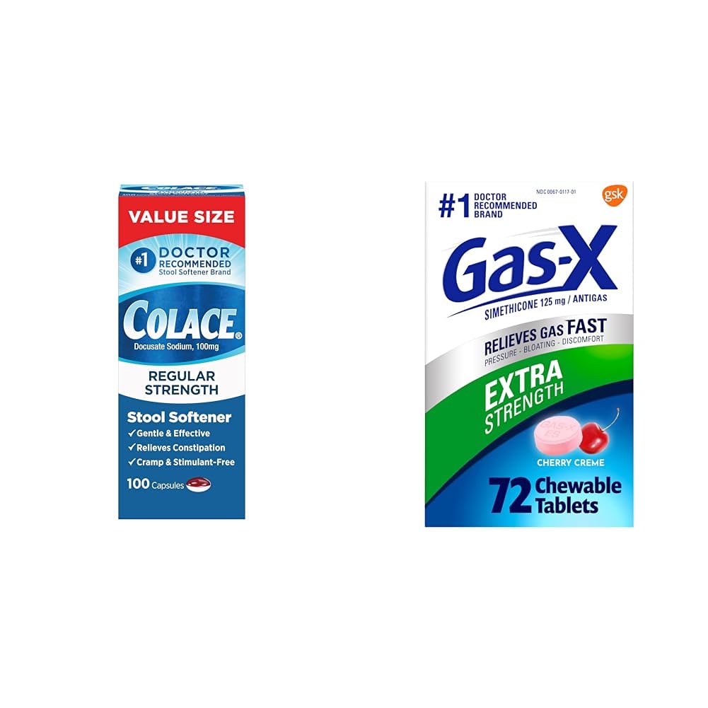 The Colace Regular Strength Stool Softener and Gas-X Extra Strength Chewable Gas Relief Tablet bundle provides gentle, stimulant-free relief from occasional constipation symptoms and fast-acting relief from gas, bloating and discomfort. The Colace capsules contain 100mg of docusate sodium per capsule to softly relax dry, hard stool over 12-72 hours, making bowel movements easier, while the Gas-X chewable tablets use 125mg simethicone to break up trapped intestinal gas bubbles that cause bloating. With 100 count of stimulant-free Colace capsules, users can experience cramp-free relief from constipation, including infrequent movements, straining and hard stools. The 72 cherry-flavored Gas-X tablets offer portable fast relief from gas pressure and discomfort in minutes, helping users feel like themselves again. As the 1 doctor recommended brands for stool softening and OTC gas relief, Colace and Gas-X are trusted solutions that work gently and effectively together to relieve occasional constipation and intestinal gas issues.