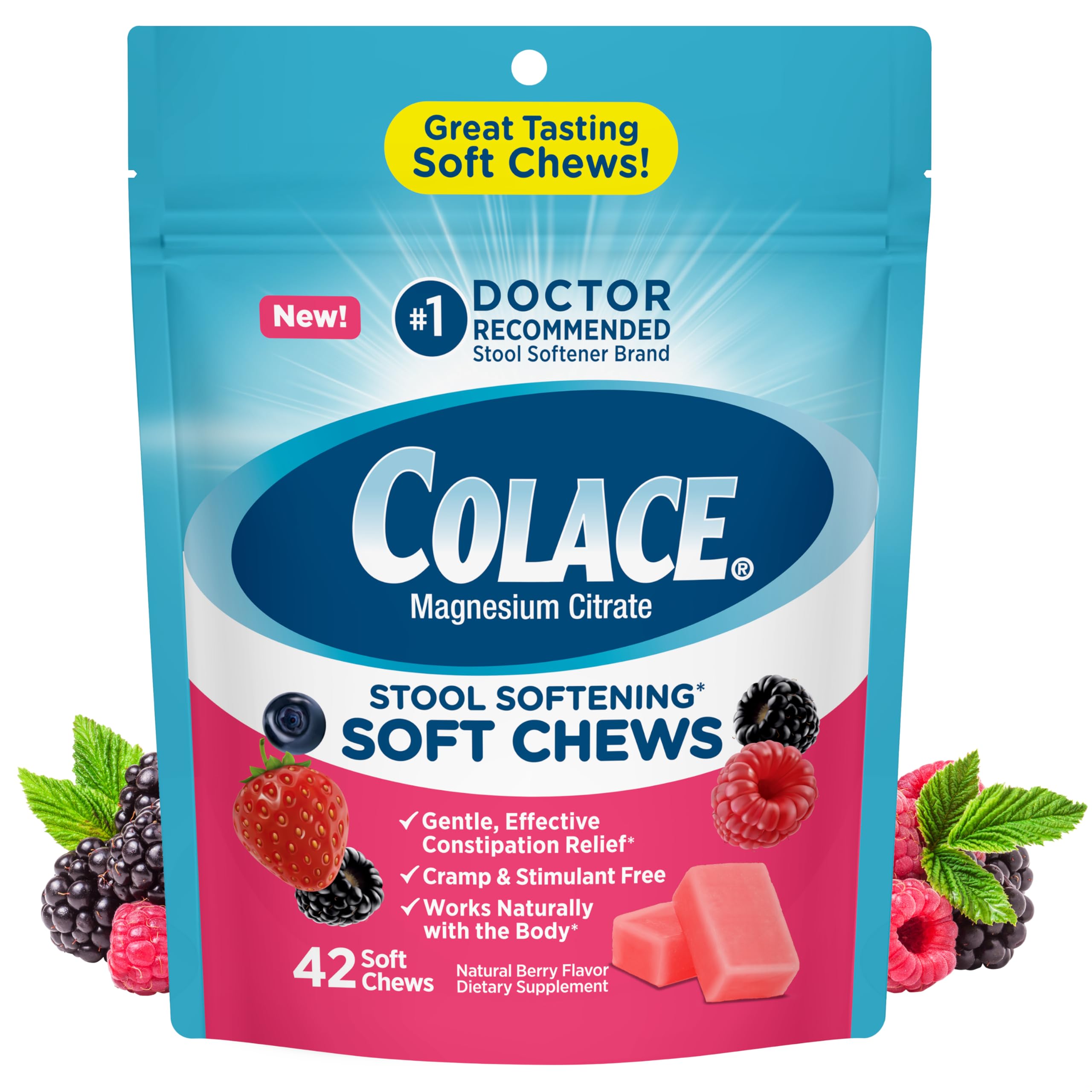 Colace, the 1 Doctor Recommended stool softener, now has soft chews. The new soft chews provide you with the same gentle constipation relief as the capsule now in a soft mixed berry chewable. Works naturally with the body, relieving discomfort from constipation by increg water in the stool, softening it and making bowel movements more comfortable. No stimulants, no straining and no cramping with Colace mixed berry soft chews