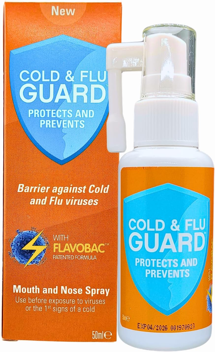 Discover Cold and Flu Guard™, a powerful non prescription 50ml oral and nasal spray meticulously designed to offer robust protection and prevention against cold and flu viruses as well as blocked nose relief. With up to 100 applications per bottle, this innovative cold and flu spray features a blend of natural active ingredients, including Flavobac™ & Hyaluronic Acid, making it the ideal choice for safeguarding your health. This cold and flu throat spray forms a protective layer, coating the back of the nose and throat where cold viruses typically take hold. It traps, neutralises, and aids the body in naturally expelling viruses, serving as a preventive measure before symptoms escalate. The hyaluronate barrier and Flavobac™, a natural citrus extract, safeguard your oral and nasal passages from harmful viruses & bacteria. . Suitable for adults and children over 5 years old, its compact 50ml size allows for on-the-go convenience, ensuring reliable protection whenever you need it. This versatile solution can be used at the earliest signs of a cold or flu or used proactively to reduce symptoms' severity & duration. It's the perfect companion for high-risk sites like shopping, public transportation, schools, universities, libraries, workplace settings. HOW TO USE The user-friendly design of Cold and Flu Guard™ensures a hassle-free application process, effortlessly administering into your nasal cavity and mouth with a simple pump action. Usage instructions, recommended dosages and frequencies are included. INGREDIENTS Water, glycerine, xylitol, polysorbate 20, bioflavonoids, mint flavor, disodium phosphate anhydrous, stevia, cetylpyridinium chloride, sodium hyaluronate. SAFETY WARNING *NOTE: Strong mint flavour. When using in the nasal cavity, may cause a slight stinging sensation and a runny nose which subside shortly. This is normal and is a sign the product is working. See moreTRUSTED BRAND - Elevate your oral care routine with Oraldent, pioneers since 1985 in preventative oral care and infection control combining science-driven innovation and customer-centric design, to offer safe, effective, and user-friendly solutions for all ages. VERSATILE & USER FRIENDLY - Suitable for both adults and children over five years old, Cold and Flu Guard is versatile and easy to use. Its user-friendly design ensures hassle-free application with a simple pump actionin a compact 50ml size, making it accessible and convenient for on-the-go treatment forkids and adults. LONG LASTING SOLUTION - With up to 100 applications per 50ml bottle, our cold and flu nasal spray offers long-lasting value. You can rely on this innovative cold and flu defence spray for extended protection, whether you're facing the first signs of a cold or flu or using it proactively to reduce symptom severity and duration, especially in high-risk scenarios. SCIENTIFICALLY PROVEN EFFIACY - Cold and Flu Guard stands out for its scientifically proven efficacy, backed by rigorous research and studies. Its formulation, featuring natural ingredients like Flavobac and Hyaluronic Acid, has undergone comprehensive testing to ensure optimal protection against a wide range of cold and flu viruses, making this your preferred cold and flu nasal throat spray for protection. POWERFUL VIRUS PROTECTION –Cold and Flu Guard is a potent 50ml oral and nasal spray that provides robust protection and prevention against cold and flu viruses. Infused with ingredients like bioflavonoids, xylitol and mint flavour*, the cold and flu guard spray's rapid action within 5 minutes forms a physical barrier in your nose and throat, effectively blocking viruses from entering your body, making it an essential shield against illness.