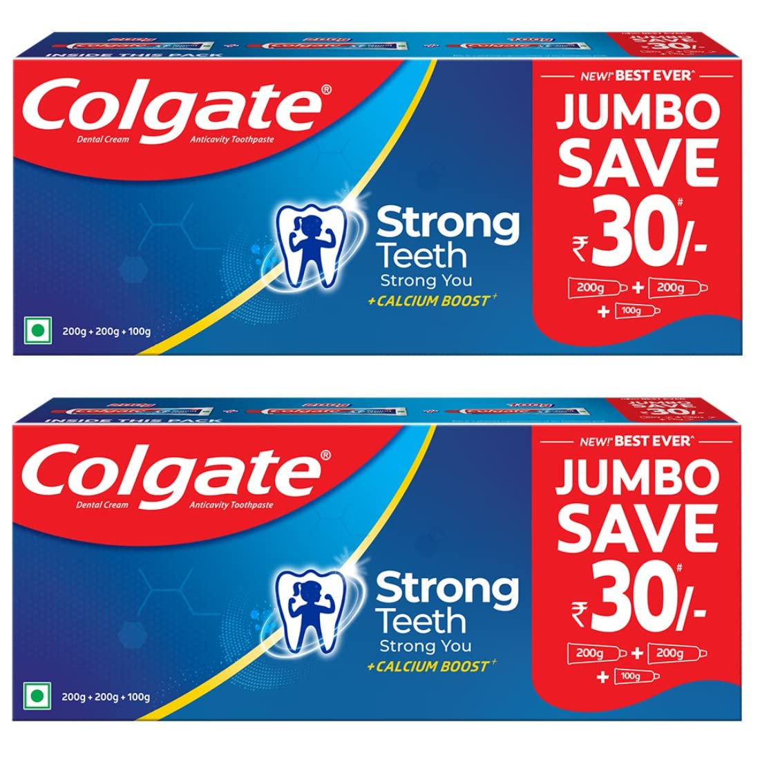 100 VEGAN, Gluten-Free and responsibly made. RECOMMENDED USAGE: Brush twice a day for 2 minutes each time. STRENGTHENS TEETH, PREVENTS CAVITIES, Whitens Teeth and Freshens Breath. NOURISHED TEETH are 2X STRONGER with COLGATE STRONG TEETH's unique Calcium Boost Arginine Formula. COLGATE STRONG TEETH NOURISHES teeth by boosting the process of natural calcium reabsorption from the saliva. NOURISHED Teeth are important as our teeth are losing calcium every day we eat sugary or junk food. COLGATE STRONG TEETH is India's no.1 toothpaste for stronger teeth for you and your family. As per Kantar Worldpanel Apr '23 report, it's the No.1 penetrated toothpaste in India, and has the highest volume share within the Toothpastes category.