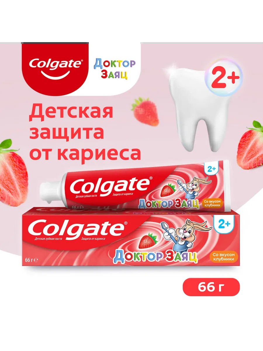 Зубная паста Colgate детская, Доктор Заяц, вкус клубники, 50 мл. Зубная паста помогает удалять налет и бактерии, которые могут вызвать кариес и заболевания десен. Это важное средство гигиены позволяет предотвратить кариес, укрепляя эмаль зубов. Зубные пасты имеют приятный вкус и аромат, которые помогают освежить дыхание и удалить неприятный запах изо рта, особенно - после приема пищи. Colgate - международная компания, производящая такие продукты, как мыло, средства для гигиены рта, зубные пасты и щётки, корма для домашних животных, бытовую химию. Компания следует принципам устойчивого развития и заботы об окружающей среде. Состав: Sorbitol, Aqua, Hydrated Silica, PEG - 12, Tetrasodium Pyrophosphate, Sodium Lauryl Sulfate, Cellulose Gum, Aroma, Sodium Saccharin, Sodium Fluoride, Mica, Eugenol, Cinnamal, Limonene, CI 42090, CI 77891 Содержит фтористый натрий. Массовая доля фторида 0,05% (500 ppm F); Действие зубной пасты: Защита от кариеса;