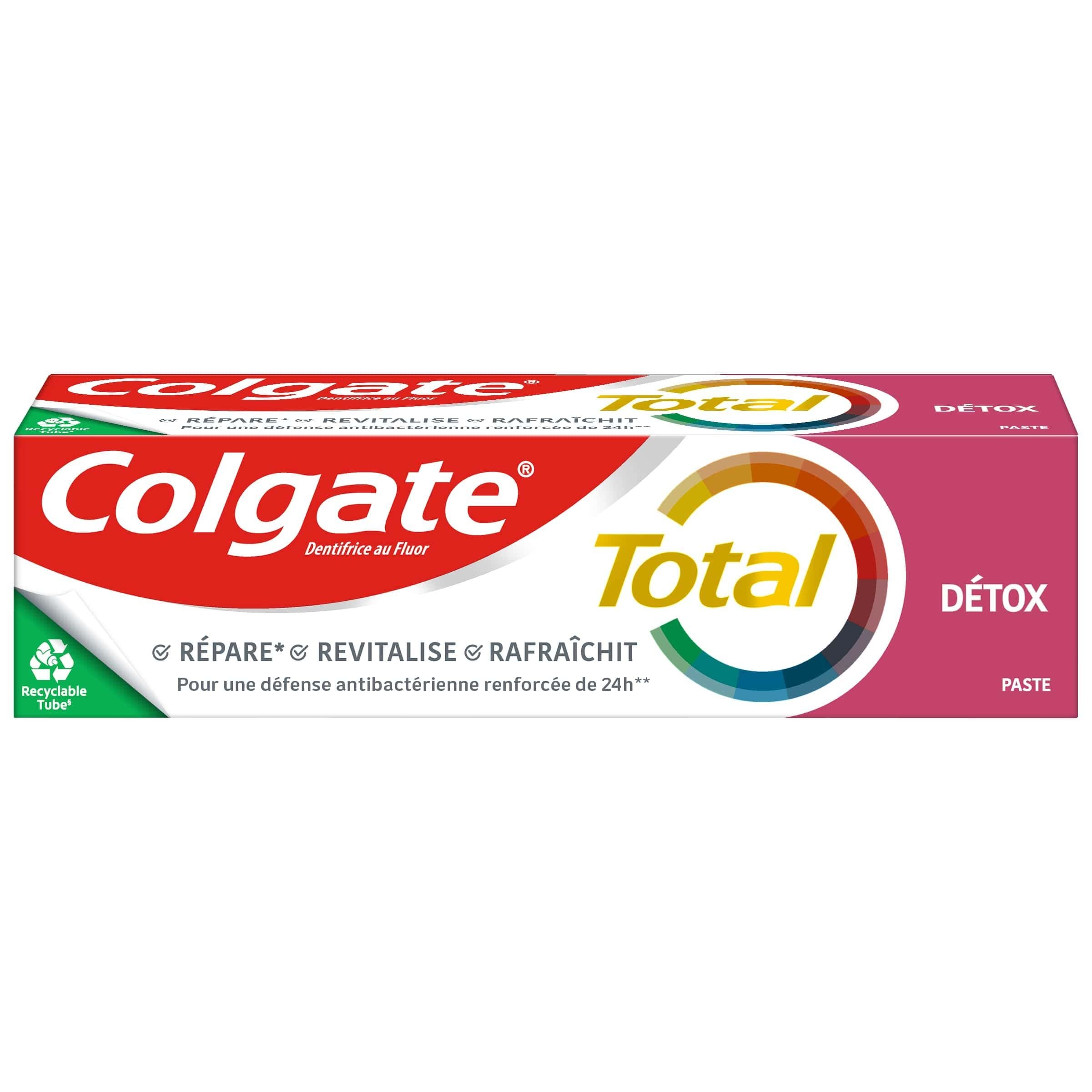 A true global leader in oral hygiene, Colgate develops innovative and effective dental care products: toothpastes, mouthwashes, and toothbrushes. Deeply committed to sustainability, the brand also offers oral hygiene education programs, training for professionals, and all sorts of tips and tricks for the general public to care for the teeth, gums, and oral health of adults and children alike. With its advanced technology, Colgate Total Detox toothpaste actively protects your entire mouth. Thanks to its dual formula with zinc and arginine, it provides 24-hour protection against bacteria. Offering comprehensive protection, it helps fight bacteria on your teeth, tongue, cheeks, and gums, for a healthy mouth and fresh breath. Intended for adults and children over 7 years old, this fluoride toothpaste helps fight oral health problems such as plaque, cavities, tartar, bad breath, tooth sensitivity, stains, and gum problems. For maximum effectiveness, brush your teeth thoroughly twice a day for at least two minutes, or as recommended by a dental professional. Superior reduction of bacteria on teeth, tongue, cheeks, and gums compared to a non-antibacterial fluoride toothpaste, with continuous use twice daily after 4 weeks. DIRECTIONS FOR USE Brush your teeth twice a day for at least 2 minutes, or as recommended by a dental professional. For optimal hygiene, change your toothbrush every 3 months.GLOBAL EXPERT IN ORAL HEALTH: Present in most countries worldwide, the Colgate brand develops innovative and effective oral hygiene products for a radiant smile and good oral health. DIRECTIONS FOR USE: Brush your teeth twice a day for at least 2 minutes, or as advised by an oral health professional. For optimal hygiene, change your toothbrush every 3 months. EFFECTIVE TEETH CLEANING AND PROTECTION: Colgate Total provides excellent protection against plaque, gum problems, tooth sensitivity, stains, tartar, cavities, and bad breath. TOOTHPASTE THAT HELPS MAINTAIN A HEALTHY MOUTH: Colgate Total Detox toothpaste has a formula that helps effectively fight bacteria on your teeth, tongue, cheeks, and gums. OPTIMAL ORAL HYGIENE: Thanks to its advanced technology, Colgate Total Detox toothpaste offers complete protection for your teeth and gums, for a clean, fresh and healthy mouth every day.COLGATE - Dentifrice Colgate Total 24H Défense Detox - Protection Complète des Dents et des Gencives - Répare - Revitalise - Rafraîchit - 75MLDESCRIPTION DU PRODUIT DESCRIPTION DU PRODUIT Véritable référence mondiale en matière d'hygiène bucco-dentaire, Colgate développe des produits de soins dentaires innovants et efficaces : dentifrices, bains de bouche, brosse à dents. Très engagée, la marque propose également des programmes d'éducation à l'hygiène bucco-dentaire, des formations pour les professionnels et toutes sortes de trucs et astuces destinés au grand public pour prendre soin des dents, des gencives et de la santé buccale des adultes comme des enfants. Avec sa technologie avancée, le dentifrice Colgate Total Détox protège activement toute votre bouche. Grâce à sa double formule à base de zinc et d'arginine, il offre à votre bouche une protection contre les bactéries pendant 24 heures . Procurant une protection complète, il aide à lutter contre les bactéries présentes sur vos dents, votre langue, vos joues et vos gencives, pour une bouche saine et une haleine fraîche. Destiné aux adultes et aux enfants de plus de 7 ans, ce dentifrice au fluor contribue à combattre les problèmes buccaux tels que la plaque dentaire, les caries, le tartre, la mauvaise haleine, la sensibilité dentaire, les tâches ou les problèmes de gencives. Pour un maximum d'efficacité, brossez-vous minutieusement les dents, deux fois par jour, pendant au moins deux minutes ou conformément aux recommandations d'un professionnel de la santé bucco-dentaire. Réduction supérieure des bactéries sur les dents, la langue, les joues et les gencives par rapport à un dentifrice fluoré non antibactérien, avec une utilisation continue 2 fois par jour après 4 semaines. MODE D'EMPLOI Brossez-vous les dents, deux fois par jour, pendant au moins 2 minutes ou conformément aux conseils d'un professionnel de la santé bucco-dentaire. Pour une hygiène optimale, changez de brosse tous les 3 moisEXPERT MONDIAL EN SANTÉ BUCCO-DENTAIRE : Présente dans la plupart des pays du monde, la marque Colgate développe des produits d'hygiène bucco-dentaire innovants et performants, pour un sourire radieux et une bonne santé buccale. MODE D'EMPLOI : Brossez-vous les dents, deux fois par jour, pendant au moins 2 minutes ou conformément aux conseils d'un professionnel de la santé bucco-dentaire. Pour une hygiène optimale, changez de brosse tous les 3 mois. NETTOYAGE ET PROTECTION EFFICACE DES DENTS : Colgate Total procure une excellente protection contre la plaque dentaire, les problèmes de gencives, la sensibilité dentaire, les taches, le tartre, les caries, la mauvaise haleine. DENTIFRICE QUI AIDE À GARDER UNE BOUCHE SAINE : Le dentifrice Colgate Total Détox possède une formule qui aide à lutter efficacement contre les bactéries présentes sur vos dents, votre langue, vos joues et vos gencives. . HYGIÈNE BUCCO-DENTAIRE OPTIMALE : Grâce à sa technologie avancée, le dentifrice Colgate Total Détox offre une protection complète de vos dents et de vos gencives, pour une bouche propre, fraîche et saine au quotidien.
