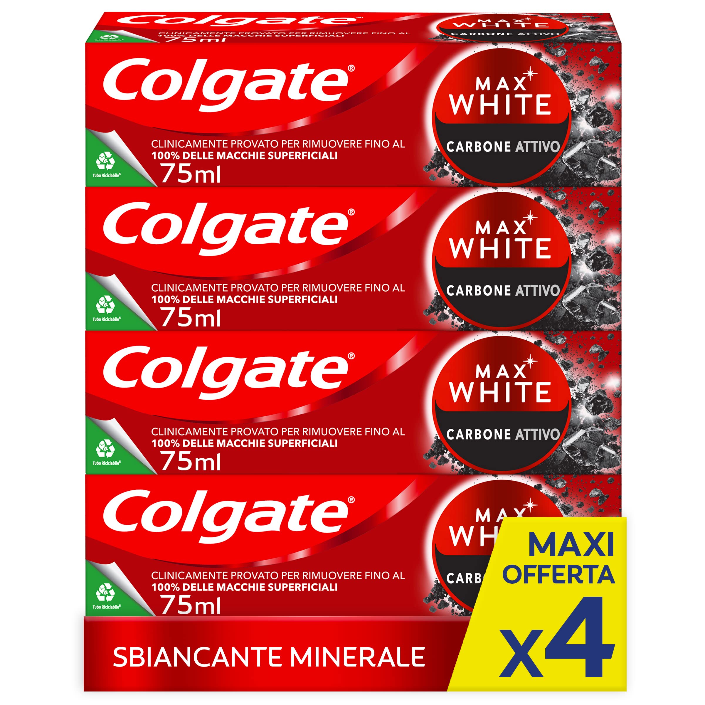 Colgate Dentifrice blanchissant Max White Carbon 4 paquets de 75 ml I Dentifrice Minéral Délicat au charbon actif pour dents Bianchil I Blanchissant les dents I Blanc naturel