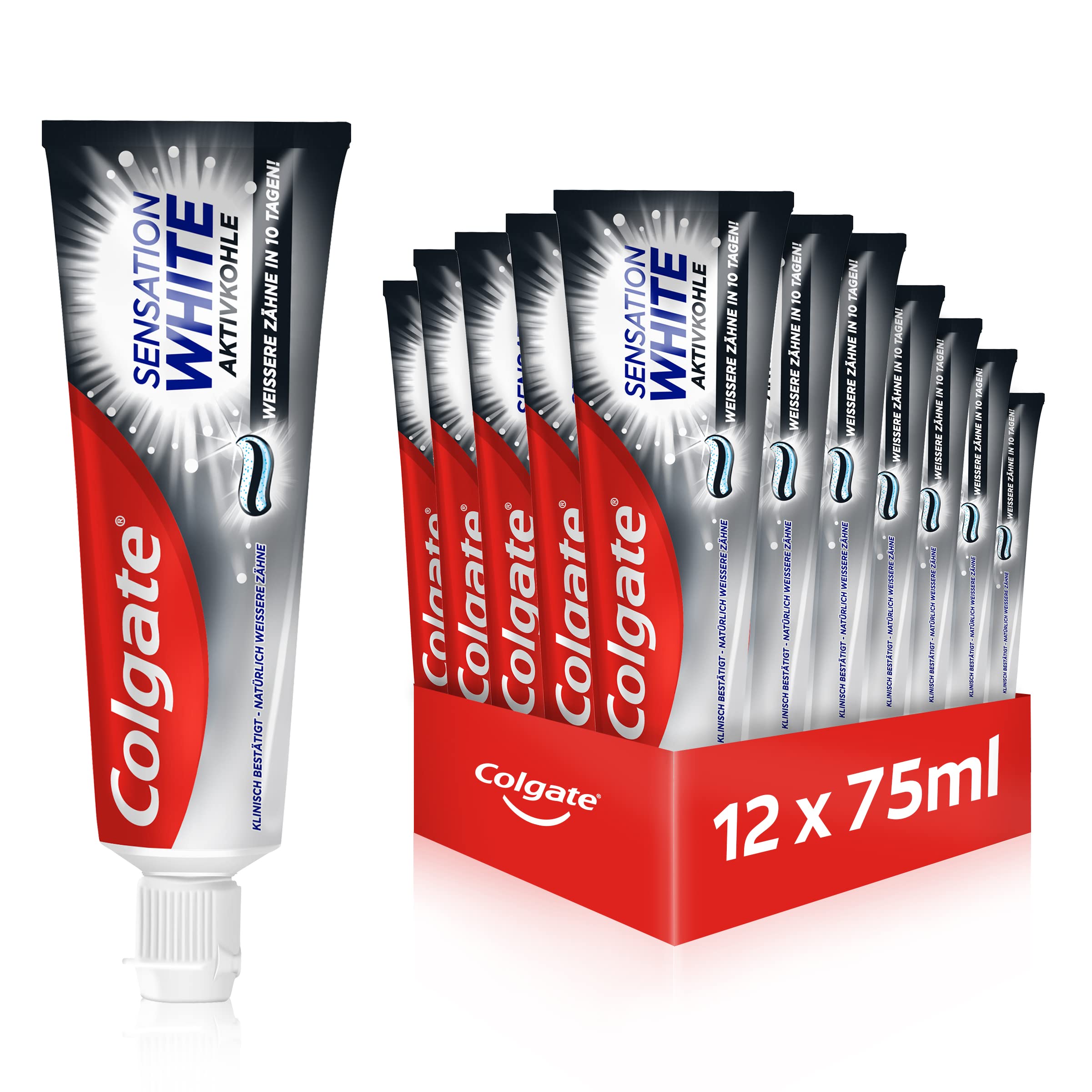 Colgate Sensation White Activated Charcoal Toothpaste - Whiter Teeth in Just 10 Days Some foods and drinks cause unsightly tooth discoloration over time. Colgate Sensation White Activated Charcoal Toothpaste with its dual cleaning system effectively removes surface stains 10 times more effectively and prevents their formation – for whiter teeth in just 10 days. The toothpaste is enriched with activated charcoal and micro-cleaning active crystals that gently polish teeth, effectively whiten them, and restore their natural whiteness – clinically proven. At the same time, the toothpaste ensures fresh breath, fights and protects against cavities, and removes plaque. Even with daily use, it protects tooth enamel. Directions for use: Brush your teeth at least twice a day or as recommended by your dentist. Close the tube tightly after use to preserve product quality. Not suitable for children under 7 years old. Product Benefits in Detail: Colgate Sensation White Activated Charcoal Toothpaste. For whiter teeth in just 10 days. Removes 10 times more surface stains and prevents new stains. Fights and protects against cavities and removes plaque. Freshens breath. Clinically tested. Suitable for daily use, does not damage tooth enamel. Contents: 12 x 75ml tubes. Like a traditional fluoride toothpaste. INGREDIENTS COLGATE DIRECTIONS FOR USE Directions for use: Apply the toothpaste to a wet toothbrush, brush in a circular motion for two minutes, then rinse thoroughly. SAFETY WARNING Keep out of reach of children and avoid contact with eyes. See moreDetails and contents of delivery: Colgate Sensation White activated charcoal toothpaste, effectively removes stains and prevents new stains, for whiter teeth in just 10 days, gentle on tooth enamel, 12 x 75 ml. Daily use: Clinically proven, this activated charcoal toothpaste protects tooth enamel, fights and protects against cavities, and safely removes plaque. For whiter teeth: This whitening toothpaste ensures fresh breath and is enriched with activated charcoal and microscopic cleaning active crystals that gently polish teeth and effectively whiten them. With activated charcoal: Colgate Sensation White activated charcoal whitening toothpaste effectively removes stains and prevents new ones from forming, so teeth stay whiter for longer. Powerful formula: Colgate toothpaste with a dual cleaning system removes 10 times more surface discoloration and restores the natural whitening of teeth – for whiter teeth in just 10 days.Colgate Dentifrice Sensation White au charbon actif 12 x 75 ml – Élimine les taches de surface en douceur pour des dents plus blanches en seulement 10 jours 75 ml (12er Pack)DESCRIPTION DU PRODUIT DESCRIPTION DU PRODUIT Dentifrice au charbon actif Colgate Sensation White - Des dents plus blanches en seulement 10 jours Certains aliments et boissons entraînent une décoloration disgracieuse des dents avec le temps. Le dentifrice au charbon actif Colgate Sensation White avec double système de nettoyage élimine efficacement les taches superficielles 10 fois plus et prévient leur formation - pour des dents plus blanches en seulement 10 jours. Le dentifrice est enrichi en charbon actif et en cristaux actifs micro-nettoyants qui polissent les dents en douceur, éclaircissent efficacement et restaurent ainsi la blancheur naturelle des dents – cliniquement confirmé. En même temps, le dentifrice assure une haleine fraîche, combat et protège contre les caries et élimine la plaque dentaire. Même lors d'une utilisation quotidienne, il protège l'émail des dents. Mode d'emploi : brosser les dents au moins deux fois par jour ou suivre les recommandations du dentiste. Refermez le tube après utilisation pour préserver la qualité du produit. Ne convient pas aux enfants de moins de 7 ans. Les avantages du produit en détail : Dentifrice au charbon actif Colgate Sensation White. Pour des dents plus blanches en seulement 10 jours. Élimine 10 fois plus de taches de surface et prévient les nouvelles taches. Combat et protège contre les caries et élimine la plaque dentaire. Rafraîchit l'haleine. Testé cliniquement. Convient pour un usage quotidien, n'abîme pas l'émail des dents. Contenu : 12 tubes de 75 ml. Comme un dentifrice traditionnel au fluorure. INGRÉDIENTS COLGATE MODE D'EMPLOI Conseils d'utilisation : appliquer le dentifrice sur une brosse à dents humide, brosser en mouvements circulaires pendant deux minutes, puis rincer abondamment. AVERTISSEMENT DE SÉCURITÉ Tenir hors de portée des enfants et éviter tout contact avec les yeux. Voir plusDétails et contenu de la livraison : dentifrice au charbon actif Colgate Sensation White, élimine efficacement les taches et prévient les nouvelles taches, pour des dents plus blanches en seulement 10 jours, doux pour l'émail des dents, 12 x 75 ml. Utilisation quotidienne : cliniquement confirmé, le dentifrice au charbon actif protège l'émail des dents, combat et protège contre les caries dentaires et élimine la plaque dentaire en toute sécurité. Pour des dents plus blanches - Le dentifrice blanchissant assure une haleine fraîche et est enrichi en charbon actif et en cristaux actifs nettoyants microscopiques qui polissent doucement les dents et éclaircissent efficacement les dents. Au charbon actif : le dentifrice blanchissant au charbon actif Colgate Sensation White élimine efficacement les taches et prévient la formation de nouvelles, de sorte que les dents restent blanches plus longtemps. Formule puissante : le dentifrice Colgate avec double système de nettoyage élimine 10 fois plus de décolorations de surface et restaure le blanchiment naturel des dents – pour des dents plus blanches en seulement 10 jours.