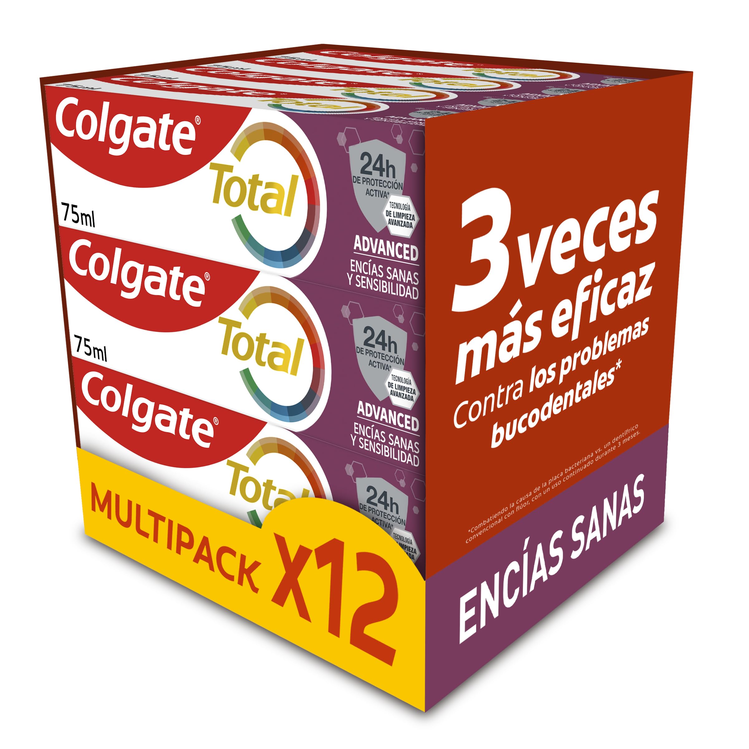 Keep your gums healthy and your bright smile protected with Colgate Total Advanced Healthy Gums toothpaste. This gum toothpaste not only protects and helps improve your gum health, but it also strengthens your mouth's natural defenses and provides 24-hour antibacterial protection with its Zinc-Amino Technology. It's a fluoride toothpaste that protects your teeth against cavities, while removing plaque and strengthening enamel. It also revitalizes your gums, reduces tartar, protects sensitive teeth, whitens, and freshens your breath so you can smile with confidence. Give your teeth and gums the protection they deserve and keep your smile bright all day long with this antibacterial toothpaste. Recyclable product (cardboard and tube). Reduction of bacteria on teeth, tongue, cheeks, and gums vs. Other non-antibacterial fluoride toothpastes, with continuous use twice a day for 4 weeks. DIRECTIONS FOR USE Apply the toothpaste to a toothbrush and brush your teeth regularly to protect sensitive areas and prevent gum problems with 24-hour antibacterial defense. SAFETY WARNING Do not swallow, keep out of reach of children, and discontinue use if irritation occurs. See moreFreshen your breath so you can smile with confidence. It also revitalizes your gums, reduces tartar, protects sensitive teeth, and whitens. It protects against cavities, removes plaque, revitalizes gums, and strengthens and repairs enamel. With its formula containing zinc and arginine, this fluoride toothpaste offers 24-hour antibacterial protection. Keep your gums healthy and your bright smile protected.Colgate Total Advanced gencives saines et sensibilité, dentifrice, 12 unités x 75 ml, protège les zones sensibles des dents, aide à prévenir les problèmes de gencives, 24 h de défense antibactérienne 75 g (Paquete de 12) Deuxième versionDESCRIPTION DU PRODUIT DESCRIPTION DU PRODUIT Gardez vos gencives saines et votre sourire brillant protégé avec le dentifrice Colgate Total Advanced gencives saines. Ce dentifrice pour gencives non seulement protège et aide à améliorer la santé de vos gencives, mais il renforce également les défenses naturelles de votre bouche et offre 24h de protection antibactérienne avec sa technologie Zinc-Amino. C'est un dentifrice au fluor qui protège vos dents contre les caries, tout en éliminant la plaque dentaire et en renforçant l'émail. Il revitalise également vos gencives, réduit le tartre, protège les dents sensibles, blanchit et rafraîchit votre haleine pour que vous souriez en toute confiance. Donnez à vos dents et gencives la protection qu'elles méritent et gardez votre sourire brillant tout au long de la journée avec ce dentifrice antibactérien. Produit recyclable (carton et tube). Réduction des bactéries sur les dents, la langue, les joues et les gencives vs. Autres dentifrices fluorés non antibactériens, avec une utilisation continue 2 fois par jour pendant 4 semaines. MODE D'EMPLOI Appliquez le dentifrice sur une brosse à dents et brossez-vous les dents régulièrement pour protéger les zones sensibles et prévenir les problèmes de gencives avec une défense antibactérienne de 24 heures AVERTISSEMENT DE SÉCURITÉ Ne pas avaler, tenir hors de portée des enfants et arrêter l'utilisation en cas d'irritation. Voir plusRafraîchissez votre souffle pour que vous souriez en toute confiance. Il revitalise également vos gencives, réduit le tartre, protège les dents sensibles et blanchit. Protège contre les caries, élimine la plaque, revitalise les gencives et renforce et répare l'émail. Avec sa formule contenant du duo zinc et de l'arginine, ce dentifrice au fluor offre 24 heures de protection antibactérienne. Gardez vos gencives saines et votre sourire brillant protégé.
