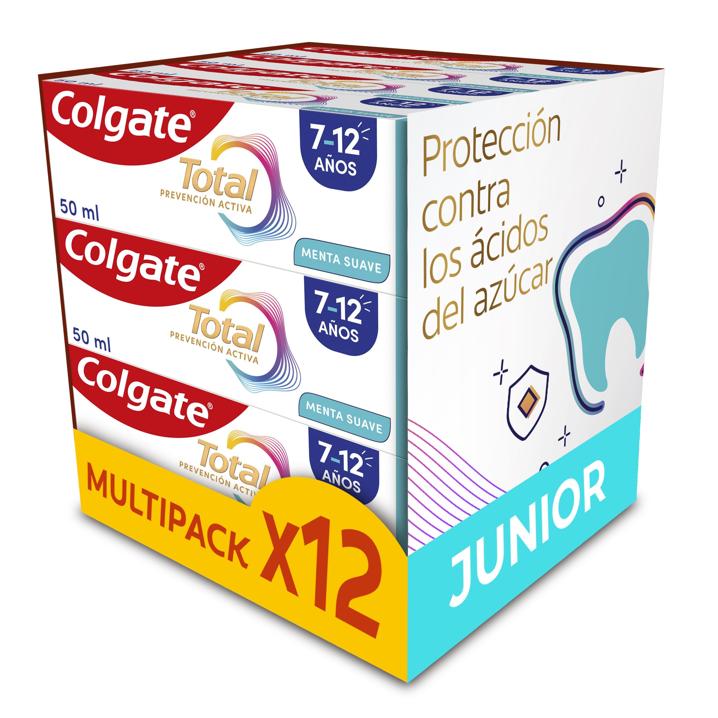 Colgate Total Children's 7-12 Years Mild Mint Flavor is a children's toothpaste, specially developed for children. Contains fluoride for cavity protection. Provides superior, long-lasting 100 mouth protection and neutralizes sugar acids. Take care of permanent teeth from the start with our advanced formula with antibacterial ingredients for total mouth protection. Recyclable product (cardboard and tube). Superior reduction of bacteria on teeth, tongue, cheeks, and gums compared to a non-antibacterial fluoride toothpaste after 12 hours following four weeks of continuous use. Fluoride provides neutralization of sugar acids. DIRECTIONS FOR USE Take a small amount of toothpaste on your brush and gently brush your teeth for 2 minutes, at least twice a day, preferably after each meal and before going to bed. SAFETY WARNING Do not swallow and keep out of reach of children under 6 years of age. If accidentally swallowed, consult a doctor. See moreFormat: Pack of 12 units of 50 ml each. This toothpaste contains antibacterial ingredients. Take care of your permanent teeth from the start. Reduces bacteria on teeth, tongue, cheeks, and gums after four weeks of continuous use. Superior, long-lasting protection for 100 of the mouth.Colgate Total Junior Lot de 12 dentifrices pour enfants, 50 ml, protection complète, dentifrice contenant du fluor, protection anti-caries, ingrédients antibactériens, produit recyclableDESCRIPTION DU PRODUIT DESCRIPTION DU PRODUIT Colgate Total enfants 7-12 ans au goût de menthe douce est un dentifrice pour enfants, spécialement développé pour les enfants. Contient du fluor pour une protection contre les caries. Fournit une protection supérieure durable à 100 de la bouche et neutralise les acides de sucre. Prenez soin des dents permanentes dès le début grâce à notre formule avancée avec des ingrédients antibactériens pour une protection totale de la bouche. Produit recyclable (carton et tube). Réduction supérieure des bactéries sur les dents, la langue, les joues et les gencives par rapport à un dentifrice au fluor non antibactérien après 12 heures après quatre semaines d'utilisation continue. Le fluor fournit la neutralisation des acides des sucres. MODE D'EMPLOI Prenez une petite quantité de dentifrice dans votre brosse et brossez-vous doucement les dents pendant 2 minutes, au moins 2 fois par jour, de préférence après chaque repas et avant de vous coucher AVERTISSEMENT DE SÉCURITÉ Ne pas avaler et tenir hors de portée des enfants de moins de 6 ans, si vous avalez accidentellement consulter un médecin. Voir plusFormat : lot de 12 unités de 50 ml chacune. Ce dentifrice contient des ingrédients antibactériens. Prenez soin des dents permanentes dès le début. Réduction des bactéries sur les dents, la langue, les joues et les gencives après quatre semaines d'utilisation continue. Protection supérieure durable sur 100 de la bouche.