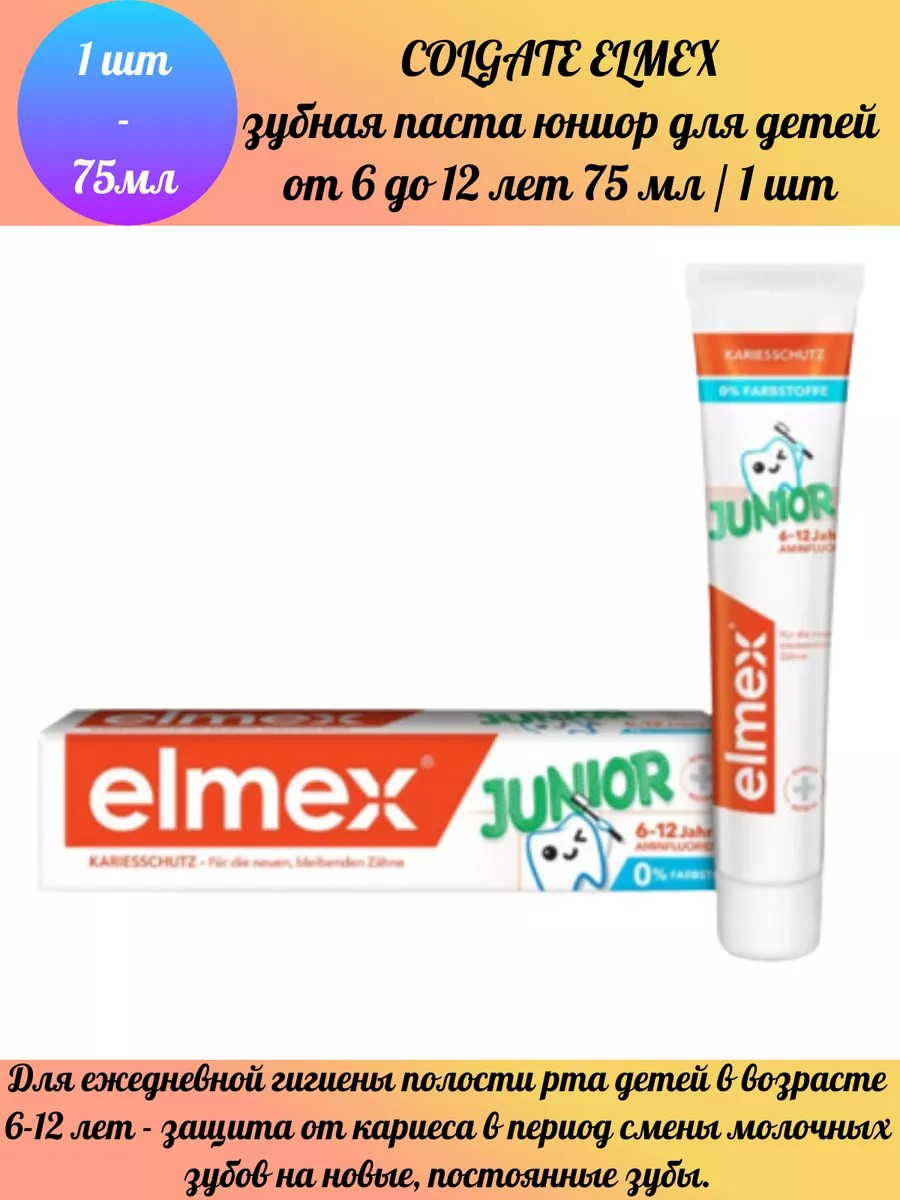 Colgate элмекс зубная паста юниор для детей от 6 до 12 лет 75 мл для ежедневной гигиены полости рта на длительное время.Разработанная специально для детей в возрасте от 6 до 12 лет, паста для зубов Элмекс обеспечивает эффективную защиту от кариеса и укрепление только прорезавшихся постоянных зубов ребенка. Безопасная и легко используемая паста для зубов делает уход за полостью рта ребенка быстрым, простым и приятным.Паста для детей Элмекс Юниор 6+ производится в соответствии с европейскими стандартами качества, что гарантирует ее безопасность и эффективность. Выбирая детскую пасту Элмекс Джуниор Вы можете быть уверены, что обеспечите своему ребенку не только эффективную защиту от кариеса, но и укрепление зубов, чтобы они сохранялись здоровыми и крепкими на долгие годы.Показания. Для ежедневной гигиены полости рта детей в возрасте 6-12 лет - защита от кариеса в период смены молочных зубов на новые, постоянные зубы. Противопоказания. Индивидуальная непереносимость компонентов продукта.При появлении каких-либо раздражений или аллергических реакций немедленно прекратить использование. Чистите зубы в течение 2х минут, после чего ополосните рот водой. Особые указания. ПРАВИЛЬНЫЙ УХОД ЗА ПОЛОСТЬЮ РТА ДЛЯ ШКОЛЬНИКОВ. С шестилетнего возраста дети уже способны чистить все поверхности зубов, но не всегда могут удалить зубной налет тщательно и полностью. Поэтому каждый день - вечером перед сном - следует повторно чистить зубы ребёнку и, в частности, новые прорезывающиеся постоянные моляры. Они особенно подвержены кариесу, потому что долгое время находятся глубже, чем жевательные поверхности молочных моляров и недостаточно самоочищаются при жевании. Температура хранения от 5℃ до 25℃.