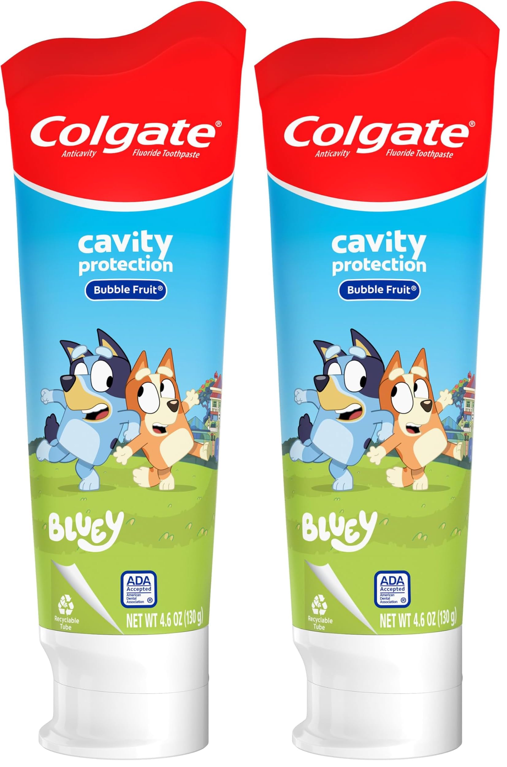 Clinically proven to fight cavities and is an ADA (American Dental Association) accepted children's toothpaste. Colgate Kids Cavity Protection Toothpaste is a gluten free toothpaste and sugar free toothpaste for kids. Mild Bubble Fruit flavor encourages regular brushing with its fun bubblegum toothpaste taste and is safe for kids ages 2 and up. Colgate kids toothpaste with fluoride fights cavities with fluoride formula. Includes one (1) 4.6 Oz tube of Colgate Kids Cavity Protection Toothpaste, Bluey Kids Toothpaste with Fluoride. The information below is per-pack only.