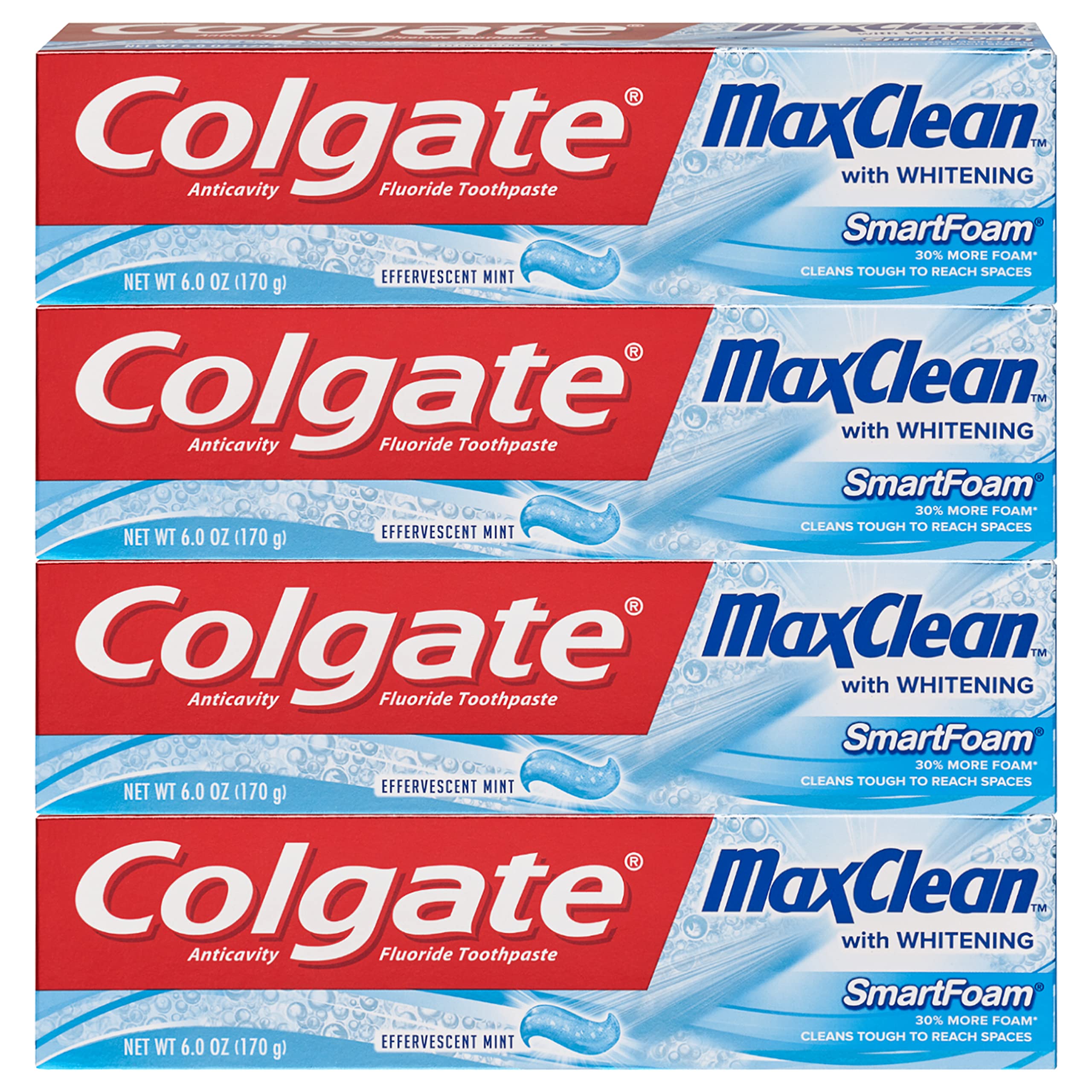 Colgate MaxClean SmartFoam is designed with a special formula that foams 30 more as you brush (vs. a leading fluoride toothpaste). It gets in between teeth and around gums, helping to remove bad-breath germs even in tough to reach spaces. Colgate Max Clean with Whitening Foaming Toothpaste also fights cavities while the Effervescent Mint flavor helps freshen your breath.