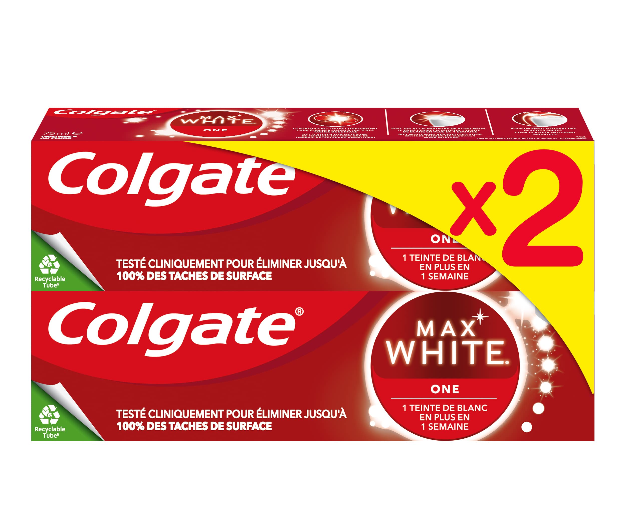 Colgate is an innovative brand that re-imagines a healthier future for all people and our planet. Colgate is the brand present in the most homes in the world. The Colgate brand is recognized for its leadership in promoting environmental sustainability, including its achievements in saving water, promoting recyclability and improving children's oral health through its "Bright Smiles, Bright Futures" program, which has reached more than 1.6 billion children since 1991. Since 2019, Colgate is committed to being a "Champion of Optimism" and wants to inspire everyone to adopt a positive attitude. A whiter smile in one week with Colgate Max White One toothpaste! Its formula combines whitening agents and cleaning particles to eliminate up to 100 of surface stains. Brushing your teeth at least twice a day helps maintain healthy gums and fight plaque. DIRECTIONS FOR USE Brush your teeth, twice a day, for at least 2 minutes or as advised by an oral health professional. For optimal hygiene, change your brush every 3 months. SAFETY WARNING Be careful not to swallow. Overdosing on fluoride can be harmful. GLOBAL EXPERT IN ORAL HEALTH: Present in most countries around the world, the Colgate brand develops innovative and effective oral hygiene products for a radiant smile and good oral health. DIRECTIONS FOR USE: Brush your teeth twice a day for at least 2 minutes or as advised by an oral health professional. For optimal hygiene, change your brush every 3 months. EFFECTIVE TEETH CLEANING: This toothpaste provides excellent protection against dental plaque, helps maintain strong enamel and healthy gums, thus maintaining optimal oral hygiene while promoting tooth whitening. COLGATE WHITENING TOOTHPASTE: Colgate Max White One toothpaste removes up to 100 of surface tooth stains, for visibly whiter teeth with a shade gain in one week. A SPARKLING SMILE: Thanks to its advanced formula with clinically proven effects, Colgate Max White One toothpaste effectively cleans teeth and makes them whiter for a dazzling smile every day. Colgate est une marque innovante qui ré-imagine un avenir plus sain pour toutes les personnes et notre planète. Colgate est la marque présente dans le plus de foyers dans le monde. La marque Colgate est reconnue pour son leadership dans la promotion de la durabilité environnementale, notamment pour ses réalisations en matière d'économie d'eau, de promotion de la recyclabilité et d'amélioration de la santé bucco-dentaire des enfants grâce à son programme "Bright Smiles, Bright Futures", qui a sensibilisé plus d'1,6 milliard d'enfants depuis 1991. Depuis 2019, Colgate s'engage à être "Champion de l'optimisme" et souhaite inciter chacun à adopter une attitude positive. Un sourire plus blanc en une semaine avec le dentifrice Colgate Max White One ! Sa formule combine agents blanchissants et particules nettoyantes pour éliminer jusqu'à 100 des tâches en surface. Se brosser les dents au moins 2 fois jour aide à maintenir des gencives saines et à lutter contre la plaque dentaire. MODE D'EMPLOI Brossez-vous les dents, deux fois par jour, pendant au moins 2 minutes ou conformément aux conseils d'un professionnel de la santé bucco-dentaire. Pour une hygiène optimale, changez de brosse tous les 3 mois. AVERTISSEMENT DE SÛRETÉ Prenez garde à ne pas avaler. Un surdosage de fluor peut être nocif. EXPERT MONDIAL EN SANTÉ BUCCO-DENTAIRE : Présente dans la plupart des pays du monde, la marque Colgate développe des produits d'hygiène bucco-dentaire innovants et performants, pour un sourire radieux et une bonne santé buccale. MODE D'EMPLOI : Brossez-vous les dents, deux fois par jour, pendant au moins 2 minutes ou conformément aux conseils d'un professionnel de la santé bucco-dentaire. Pour une hygiène optimale, changez de brosse tous les 3 mois. NETTOYAGE EFFICACE DES DENTS : Ce dentifrice procure une excellente protection contre la plaque dentaire, aide à conserver un émail solide et des gencives saines, préservant ainsi l'hygiène buccale de manière optimale tout en favorisant le blanchissement des dents. DENTIFRICE BLANCHISSANT COLGATE : Le dentifrice Colgate Max White One élimine jusqu'à 100 des taches dentaires de surface, pour des dents visiblement plus blanches avec une teinte gagnée en une semaine. UN SOURIRE ÉTINCELANT : Grâce à sa formule avancée aux effets cliniquement prouvés, le dentifrice Colgate Max White One nettoie efficacement les dents et les rend plus blanches pour un sourire éclatant au quotidien.
